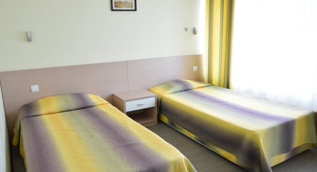Отель в районе болгарских дач бывших журналистов (вилна зона). Место зеленое. Соловьи. Отель на горке. Море видно с балкона. Наш номер был двухместный коннект сьют (две комнаты, разделенные дверью). Плюс балкон на обе комнаты. Кухни нет, хотя в Библио-Глобусе говорили. что кухня есть! Уборка номера каждый день. Оставляли по 2 лева. Смена полотенец каждый день. Белья - через 3 дня.