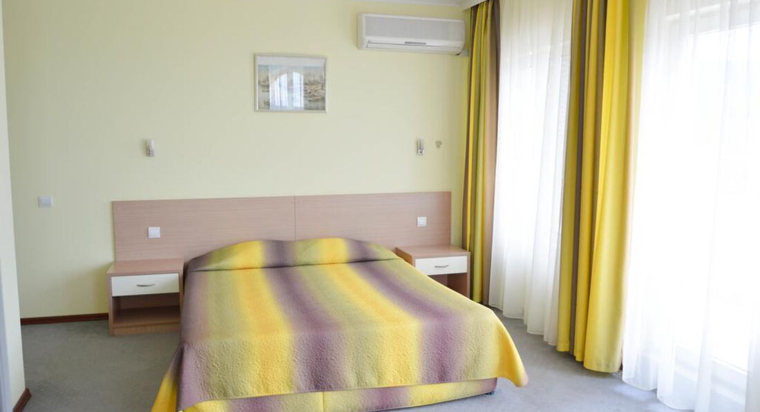Отдыхали семьей в июле 2015 г.Симпатичный, небольшой, красивая территория. Персонал вообще не понимает по-русски. Отель для тех, у кого есть автомобиль, так как море настолько далеко, что дорога вниз с горы занимала 20 минут, а назад минут 30-35 ( нас было 3, родители и ребенок 13 лет). Номер неплохой, вид на заповедник и сбоку море, мы попросили столик и стулья на балкон, принесли. В номере маленький холодильник, телевизор коробка, пару русских каналов шло, в ванной комнате не работал держатель для душа. Убирали плохо, протирали проход между кроватью и тумбой для телевизора, полотенца меняли раз в 3 дня, приходилось сушить на балконе. Кондиционер был, но не работал, открывали ночью балкон. Отель находится выше всех, рядом замороженная стройка, частный дом и заброшенный пансионат, выше - заповедник, пробовала подняться вверх - там непроходимые чаща. Еды было достаточно, вполне разнообразная, очень понравился йогурт с медом! В отеле живут несколько милейших котов ( привет хулигану, пытавшемуся забраться на стол в беседке). Отдых прошёл нормально, мы ездили часто в Варну на автобусе, брали экскурсии на Золотых песках в Каменный лес и пещеры Аладжа, очень интересно, лучший экскурсовод Лора. Ездили в Несебр, понравился Солнечный берег, инфраструктура там гораздо более развитая. Основная проблема отеля - его расположение в плане расстояния до моря, что решается, если есть автомобиль.