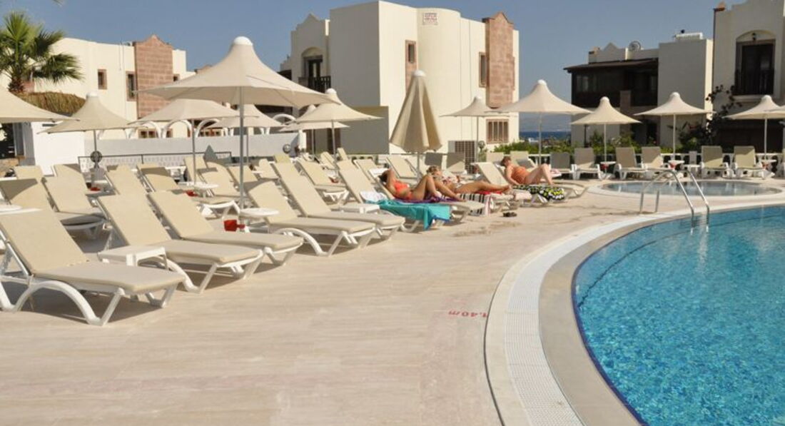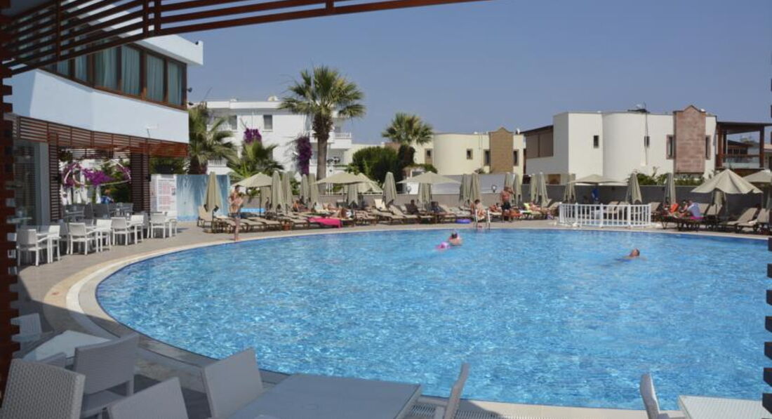 Отдыхали в этом отеле с ребенком.Отель ниразу не 4* а твердая тройка и этим все сказано, находиться недолеко от городка Тургутреис, до кторого можно добраться на машине или на маршрутки.Маршрутки до 20.00ч.Вечером за территорию отеля далеко невыйдешь, освещения нет, развлечений в виде дискотек, баров по близости тоже нет, так что приготовтись к спокойному отдыху на территории отеля.Есть взрослые и детские анимации. Детские анимации в виде детской дискотеки, а для взрослых устраивают конкурсы. Запаситесь аптечкой, т.к. еда практически без разнообразия и острая..Уборка номеров регулярная, но вот белье за 15 дней поменяли один раз. Возьмите навсякий случай фумигатор-Оказывается в Бодруме много камаров.Бассеин один взрослый и один детский, территории около бассеина мало, так что любителей позагарать у бассеина ждет разочарование, т.к места надо будет забивать заранее..Море волнистое и на пляже ветренно-специфика этого местечка.Русского языка там действительно незнают.Отдыхающих в этом отеле большенство поляков, турков и русских.