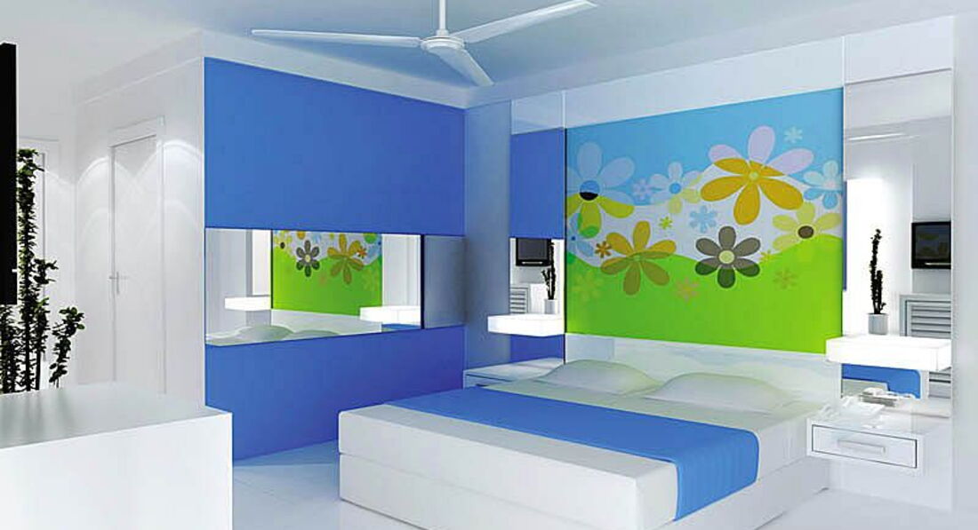 Комната хорошая, вся белая, с яркой синей картиной. Занавески только страшные, портят интерьер. У кондиционера отсутствовала пластиковая створка, которая направляет воздух. Вызвали мастера, тот вставил ее, но поднимать вверх/вниз нужно было руками, так как моторчик подъемного механизма, оказывается сломался. Не могла открыть сейф, посоветовали позвонить на ресепшен. Но телефон в номере также не работал. Позже выяснилось, что сейф платный!! 3 евро в сутки. Телефон тоже починили, намусорили, и чтоб это все убрали, пришлось уже к вечеру вызывать уборщицу подмести. Горячей воды до середины дня вообще нет. Ответили на это: включите и ждите 10 минут. Заглушки на ванной нет, чтоб искупать ребенка 7 месяцев, вертитесь, как хотите. Интернет это отдельная песня. Ни в одной точке отеля он нормально не работал за исключением ночи, когда все спят, и никто не пользуется трафиком. Роутеры видите ли старые, кабели тоже.