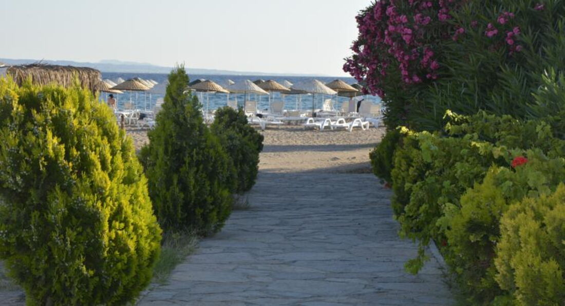 Пишу по свежим следам) Были в начале августа неделю, отель действительно достойный! Несмотря на высокий сезон, места на пляже были всегда, пляж большой, "нетесный", песок, есть понтон, море холодное! Говорят, Эгейское море всегда очень бодрящее и тонизирующее)))) Наверно, поэтому пляж был полупустой, народ тусил у бассейна - там и еда, и питье))) Полотенца выдают, меняй хоть два раза в день. На плаже есть бич-бар, часы работы с 10 до 18 часов, только вода и юпи. С моря всегда дует свежий бриз, поэтому не чувствуется жара, очень комфортно. Через 5 км в поле видимости Греческие острова, очень близко. Много внимания уделяю описанию пляжа, т.к. это для меня важнее, чем все остальное)))