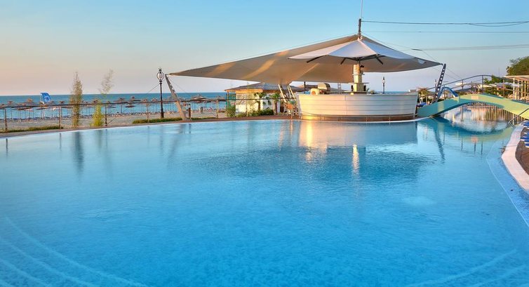 Прочитала предыдущий отзыв, поулыбалась.И было бы весело.если бы не такие затраченные средства и не очень приятный отдых.Расположение самого отеля нам понравилось ,тихо и не так далеко от центра,можно и дойти до центра, и доехать на паровозике, но цена для семьи туда- обратно великовата,поэтому тоже не наездишься. Отдыхали семьей 2 взрослых и 2 детей 11 и 6 лет.В отель приехали примерно в 9.30, и хотя на сайте отеля есть услуга раннего и позднего заселения и выселения по 40 левов ,нам эту услугу предоставить не смогли.Хорошо,что сразу одели нам браслеты, и мы могли хотя бы покушать до 14 часов без проблем. НОМЕР.Номер нам дали огромный ,но до того бестолковый и несуразный,прямо караван-сарай,что первым желанием было его поменять,но не было свободных других номеро, и нам не поменяли.В номере стояла большая кровать , по бокам односпальные кровати,прикроватные тумбочки,холодильник,диван.При огромном размере номера вещи разложить,как я люблю,возможности не было нормально,пришлось изощряться и класть их на полки ,типа книжных.Плоский телевизор в углу на тумбочке напротив дивана,если кто-то хотел пройти в ванную комнату или туалет,то дверь закрывала телевизор.Огромный балкон,наша радость и успокоение.В ванной душевая кабина ,раковина и унитаз,крышка которого ,как только ты на него сядешь ,утыкалась тебе в спину.Мы -то ладно,ребенок маленький и худенький от этого страдал.За день мы к номеру привыкли,и даже то, что ковролин перед ванной комнатой почему-то становился очень мокрый ,нас уже не особо волновало,хотя при мытье мы воду на пол старались не лить вообще.Что-то там откуда-то текло.На чистоту в номере старались внимания не обращать,но номер думаю ни разу за время нашего отдыха не пылесосился,поэтому мы сами,как могли соблюдали чистоту,чтобы не стало еще грязнее.Когда позже мы познакомились с людьми,которые стали нам хорошими друзьями,посмотрели их номер,то были вообще в шоке.У них была просто конура.Наш номер показался хорошим. Сервис и обслуживание..Когда мы приехали в отеле было ооочень много народу и как раз это было то,что предыдущий автор назвал цыганским табором.Такого я еще никогда не видела и больше не хочу видеть.Сдвигались столы на завтрак ,обед и ужин,накрывались,к подносам с едой невозможно было подойти.Все вмиг сметалось.Все эти люди очень громко разговаривали,кричали.Вечером гульба продолжалась под окнами,дети орали и бегали до 12 ночи,кидали и все время двигали детские столы и стулья.В первую ночь музыка орала всю ночь и даже не замолчала,когда пришло утро.Утром рано эта гульба продолжилась на пляже с большим бутылем непонятно чего.Все это продолжалось первые 4 дня,в конце которого я сказала,что я устала от этой борьбы за живучесть и вообще не пойду ужинать,лучше в кафе пойду спокойно поем.Персонал в столовой или кафе,не знаю ,как сказать,уставший.Когда этот табор уехал,мы видели ,как официанты танцевали,потому что наступило временное затишье.Стало возможно подойти к столам,взять еду,наступила тишина.А еще говорят про русских туристов.Да русский турист по сравнению с румынами это наимилейшие люди . Еще в один вечер приехала группа молодых немцев,они пили весь день и всю ночь орали,смеялись, и в конце концов так загадили туалет на ресепшене,что запах висел еще день,а бедные уборщицы там не могли отмыть результаты отдыха этих свин