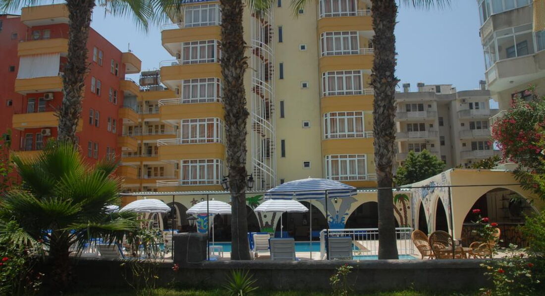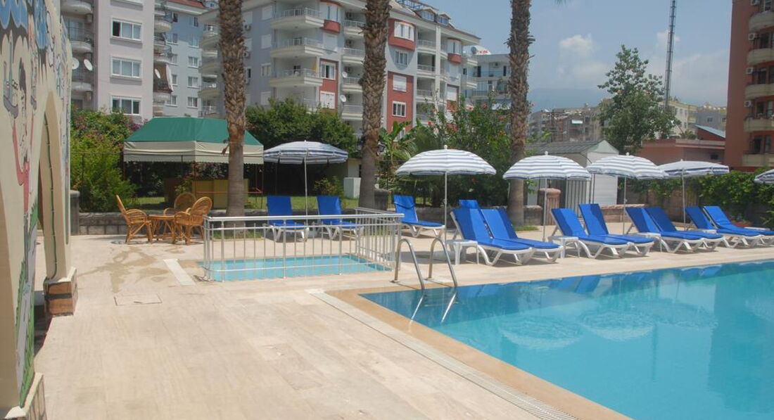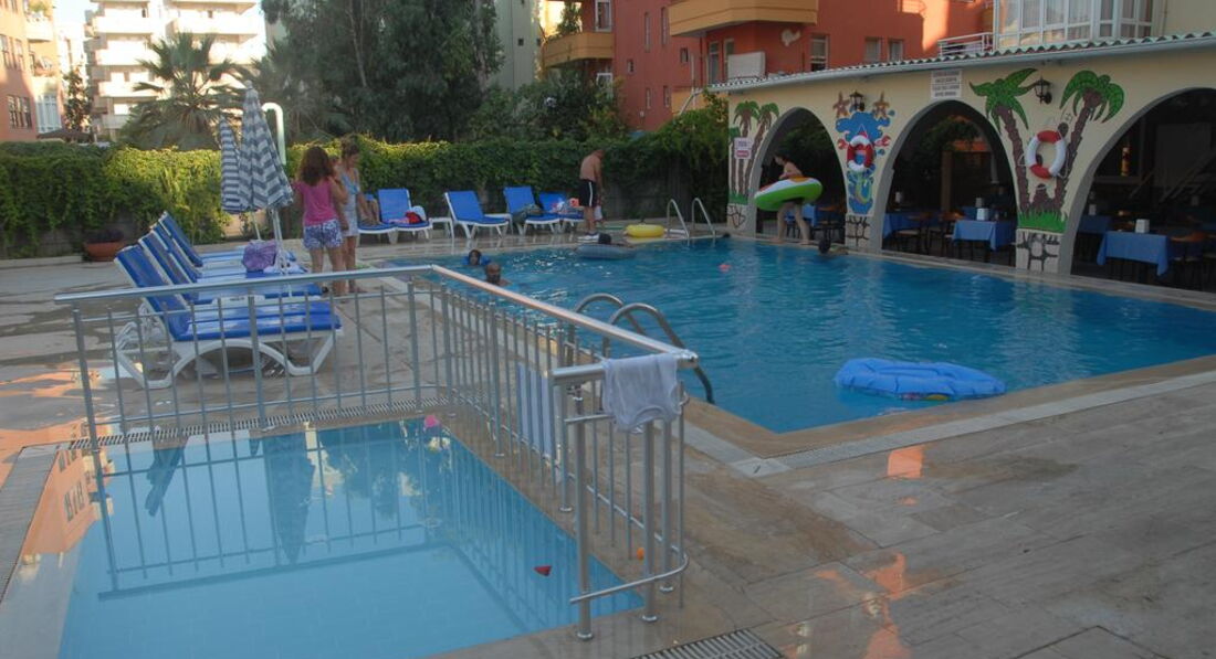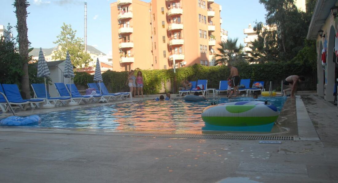 Небольшой отель в тихой улочке.Ремонт сделан недавно.Номера небольшие,стандартные.Всё работало.Душ маленький,сантехника норм,иногда были проблемы с водой.Душевые принадлежности,только в день приезда,больше не пополнялись.Уборка номеров через день.Полотенца меняются постоянно (не забывайте бросать их на пол,если хотите чтобы их заменили).Wi-Fi ловит везде.Питание однообразное,соответствует отелю 3*.Территория небольшая,есть три бассейна,один с горкой и один из них детский.Пляж через подземный переход,чистый-мелкая галька.Шезлонги,зонты-бесплатно.До центра далековато,мы развлекали себя экскурсиями.Одну экск.,повелись на страшилки отельного гида и взяли у него,заплатили в 2 раза дороже,а ехали в одном автобусе и те кто купил на улице (дешевле)и такие как мы((Потом уже и мы стали умнее,недалеко от отеля нашли офис,он рядом с высоким отелем Diamond,красненький офис,его трудно не заметить,взяли яхту-было интересно и весело,хамам-за невысокую стоимость получили массу удовольствия.Джип-сафари-все просто в восторге!В ВК(в контакте)есть их группа Tours From Alanya.Экск.из Алании,(офис с таким же названием)там можно посмотреть прайс.Мы довольны!Рекомендую!Не переплачивайте за такие же экск. в отеле.Вечером можно погулять по красивой набережной.