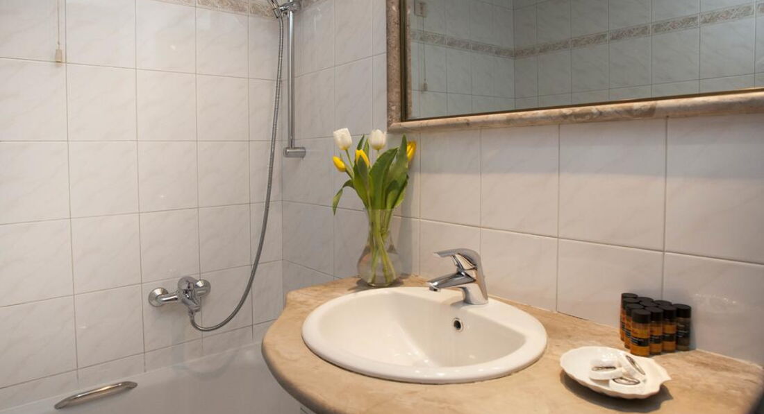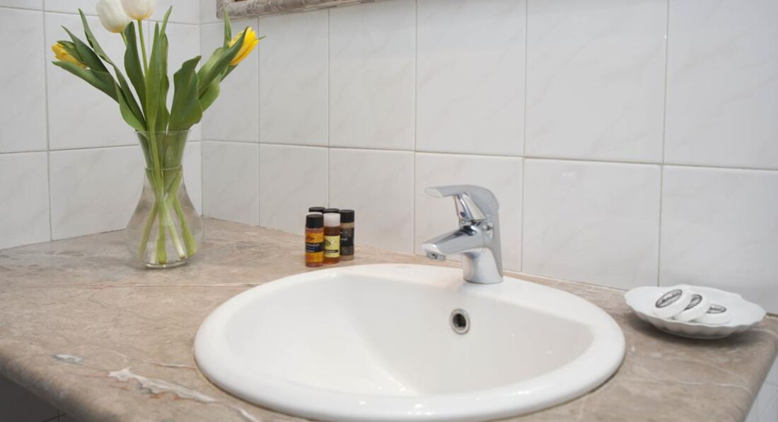 •ванна кімната з душовою кабіною, феном і туалетним приладдям.
