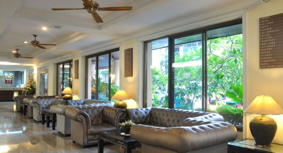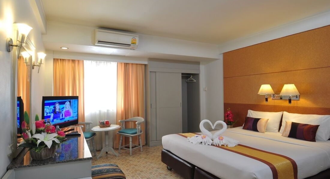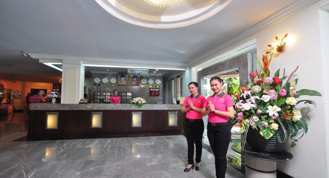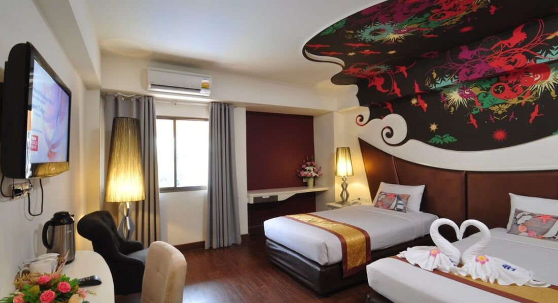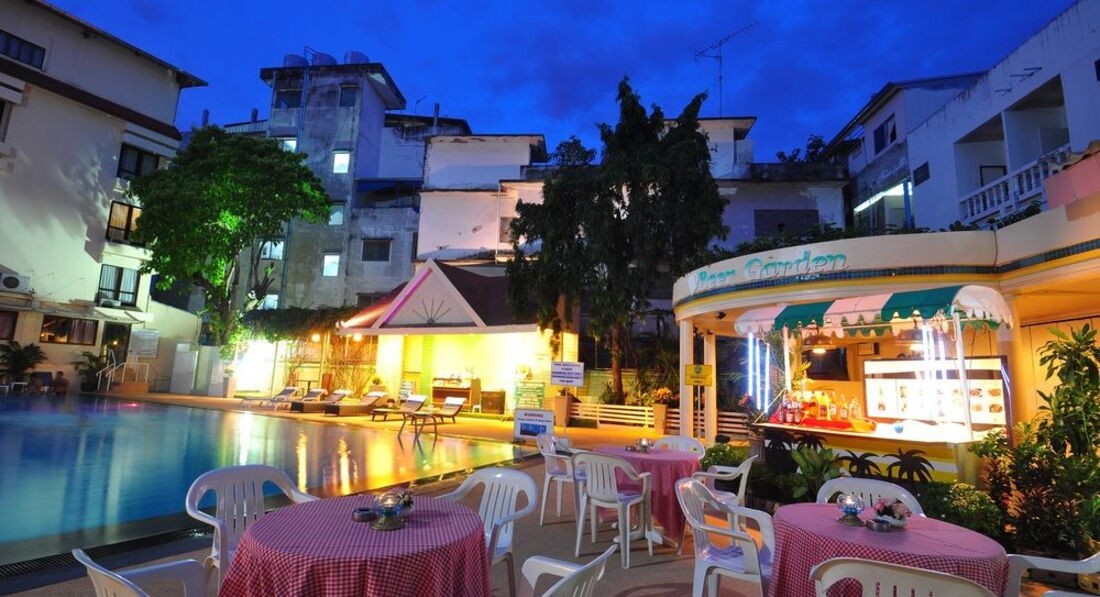Небольшой отель в 5-7 минутах ходьбы от walkin street. Ездили с друзьями 9 человек, выбирали бюджетный отель и поближе к волкин стрит, знали, что будем только приходить и ночевать. Поселили нас не сразу, приехали в 8-9 утра, сказали, что заселять будут только после двух, но заселили часов в 12. Двух человек вообще не было в списках. Звонили гиду, выясняли, после звонка все списки нашлись. По русски персонал не говорит и по англ. тоже не особо. Поселили нас в разные номера на разных этажах. Номера немного отличались. Большие кровати, телевизор, кондиционер в номере. Ванна и туалет в хорошем состоянии все. Мебель вся старенькая, убогенькая, но чистая. Уборку делали каждый день, белье меняли тоже часто. У некоторых друзей были в номерах тараканы. Это номера, которые выходят на внешнюю сторону отеля. У всех, у кого номера выходили внутрь отеля, на бассейн, тараканов не было. Клопов не было ни у кого. Мы их очень боялись, прочитав здесь отзывы.