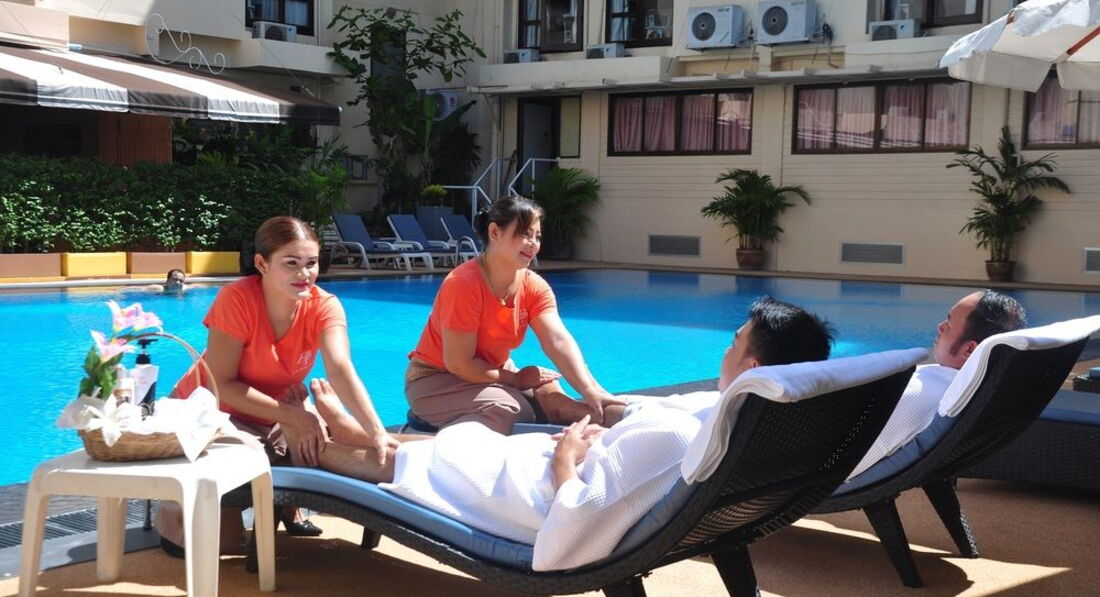 Территория отеля маленькая, но это объясняется локацией в центре города - 5 минут до главной тусовочной улицы Walkin Street. Дико бесил ремонт, проводимый в ресторане по вечерам. Т.е. люди сидят у бассейна, слушают, как тайцы отрывают куски потолка, плюс через это приходилось ходить. Бассейн у них хороший, большой, утопает в зелени, глубокий, причем от мелкого к глубокому, удобный спуск. Все было хорошо, но где-то спустя 2 дня после нашего приезда в отель заехали индусы и началось... Это как наши кавказцы, только еще хуже. Они оккупировали бассейн уже в 9 утра и сидели в нем до восьми вечера (до закрытия). За все это время никто из них не сходил в туалет у бассейна, мы подозреваем, что все они делали в бассейне, они включали свои национальные песни, танцевали у бассейна и это было ужасно. Грязные, шумные, наглые. И вот так каждый день... Туалеты в отеле, кстати, очень чистые, у раковин живые орхидеи стоят))) Не понравилось также, что у отеля перед выходом на улицу по вечерам торчали их местные проститутки. Из плюсов еще: 7-eleven в 2 минутах ходьбы от отеля (выходишь на улицу из отеля и налево). А еще в холле отеля есть два компьютера для бесплатного пользования. Пароль от вай-фая (если вы с планшетом, смартфоном или ноутбуком) выдают по запросу (но он регулярно слетает, поэтому нужно просить у них, чтоб перезагружали). Еще мы заказывали массаж при отеле (на первом этаже сидят около лифта), делают неплохо, но разводят на бабки))))