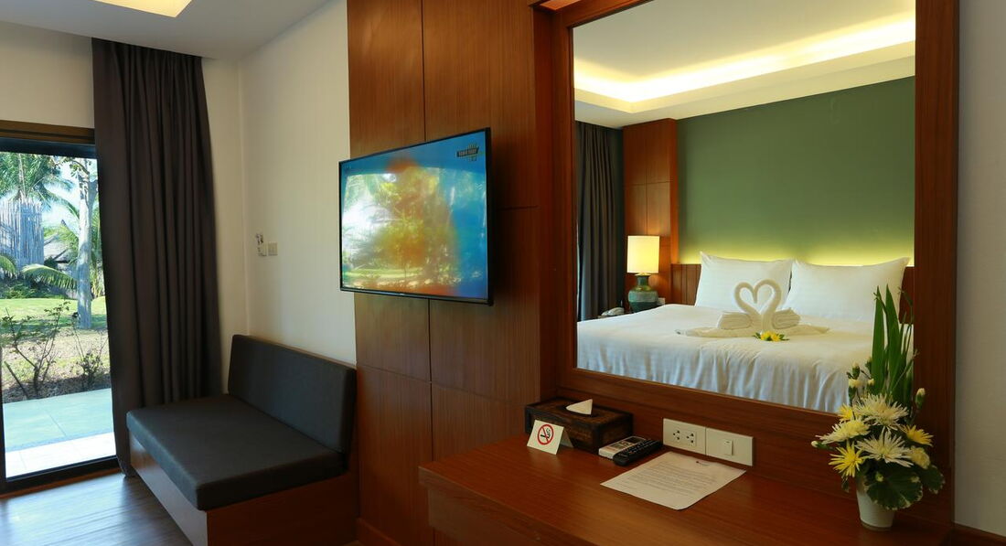 Типи номерів: • 25 superior (24 кв.м, ліжко dbl (двоспальне), макс.2+1 чол, без можливості дод.ліжка, вид на сад, 2-поверхова будівля, ближче до в'їзду в готель) • 50 deluxe sea view (32 кв.м, 20 dbl/30 twin, макс.2+1 чол, вид на море, основна будівля, 2-4 поверхи) • 4 grand sea view suite (64 кв.м, макс.2+2 чол, вид на море, джакузі, велика тераса, 4-поверхова будівля біля пляжу, 2-4 поверхи) • 41 cottage (28 кв.м, 20 dbl/21 twin, макс.2+1 чол, без можливості дод.ліжка, вид на сад, 2 поверхові котеджі на 4 номери, ближче до в'їзду в готель) • 65 villa garden (48 кв.м, 45 dbl/20 twin, макс.2+1 чол, вид на сад, 2-поверхові вілли, по 2 номери) • 10 villa sea view (48 кв.м, ліжко dbl, макс.2+1 чол, вид на море) Компліменти іменинникам – торт; молодятам – прикраса номера.У номері: • кондиціонер • ТБ (є російський канал) • телефон • Wi-Fi (безкоштовно) • сейф • стіл стілець • міні-бар • 2 бут.води щодня безкоштовно • набір для приготування чаю/кави • душ (з туалетним приладдям) • фен • балкон/тераса
