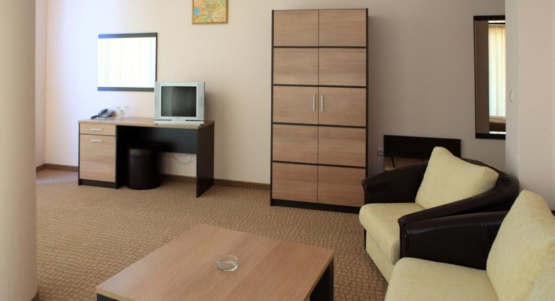 Показали нам номер и мне стало грустно, море увидеть было крайне сложно-перегнувшись через перила, фото приложу( не советую переплачивать за вид на море-вероятность что обрадуетесь очень велика!!!вероятно, что номера с достойным видом держат для своих( болгарских туристов-которые просто не заплатят за тот вид что был у нас-наличными, а не через турфирму Солдрекс как мы - то деваться не куда!!!Наш вид был на окна соседнего здания и задворки соседних аппртаментов( где с пятницы просто безобразно гуляли и орали местные по воскресенье-мы закрывали балкон, что бы можно было как то уснуть(