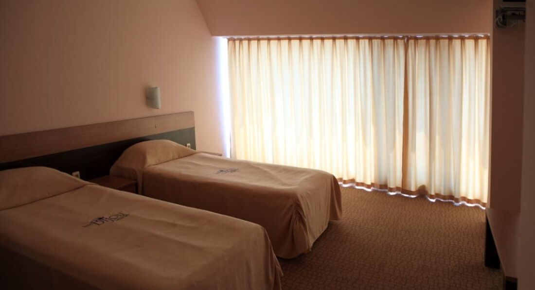 Прилетели в Бургас ночью, забрали нас на мини-бусике и повезли в Равду. Доехали быстро, минут 20, заселились еще быстрее. Бронировали номер стандартный с видом на море, нам достался номер на втором этаже с боковым видом на море. Номер самый обычный, соответствует 3*. Прямой вид на море — дороже и выше категорией. Вид из номера — пустырь заросший травой (территория бывшего детского лагеря) и море.