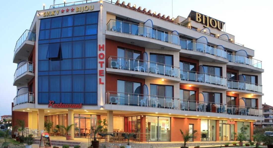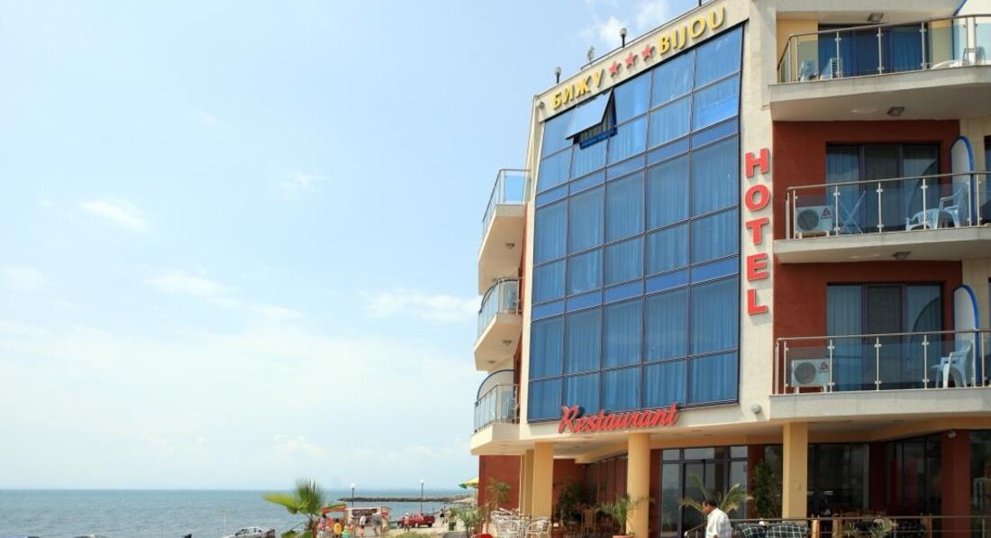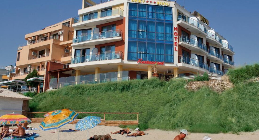 Отель очень хорошо расположен — рядом — в пяти минутах остановка транспорта, с которой можно уехать в любой курорт, и кафешки ну и море сразу. Море - отдельная тема. Бижу стоит бок о бок с отелем Блян, оба они смотрят на пирс, за которым расположена ферма мидий. Поэтому когда ветер дует с моря, запах стоит соответствующий. Но это не страшно, т. к. можно отойти по пляжу метров 20 и запах исчезнет. Это центральный пляж Равды. Нам он не очень понравился мы любили гулять в третью бухту налево. Там есть отличный, хоть и не дешевый бар, с красивыми и удобными зонтами и шезлонгами — в начале сезона шикарный зонт+шезлонга два стоил 15 лев (плюс — не обязательно весь день находится на пляже, можно уходить-приходить, все оборудование за вами закрепится на весь день). К примеру возле отеля — 6 лев — зонт и 6 каждый шезлонг. При этом же баре и всякие развлекушки водные — бананы, скутеры, серфинг и т. д. Если же пойти направо от отеля, то перейдя через стройку и пустырь можно попасть на Европейский пляж — там красивый аккуратный парк, несколько кафешек.