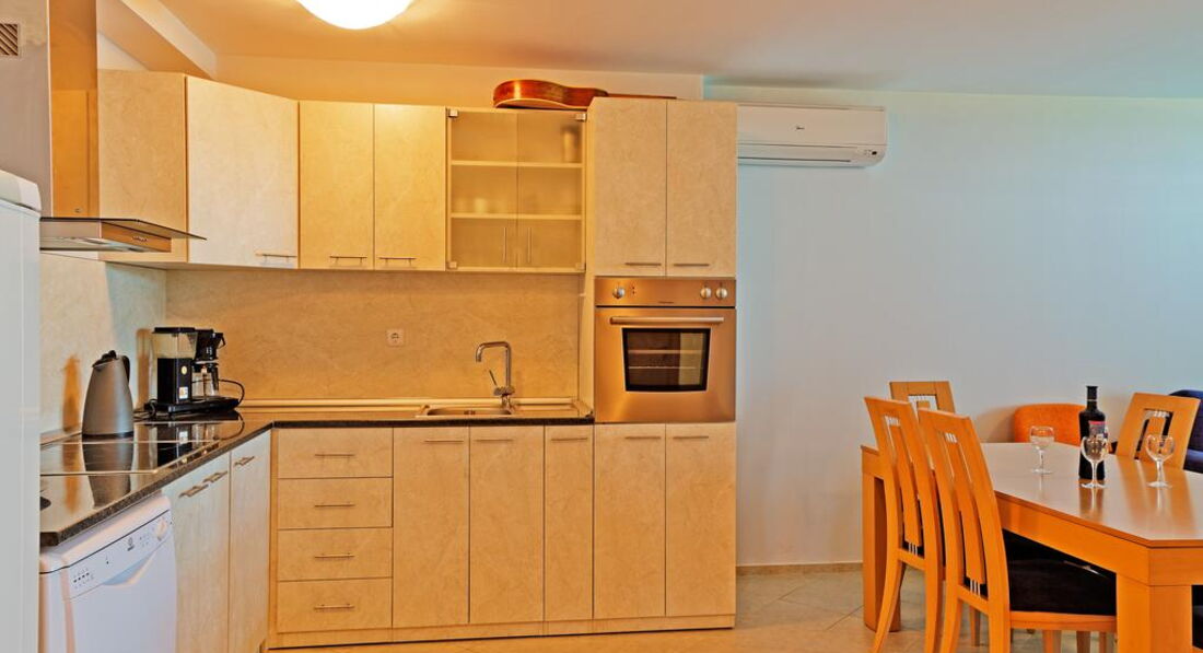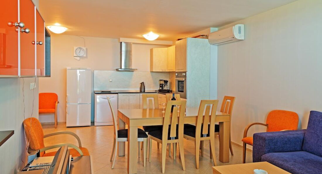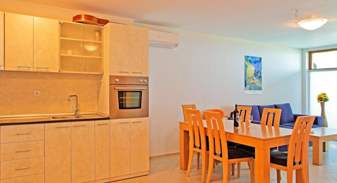 отель красивый, ухоженный, на самом берегу моря, расположение прикрывает минусы в сервисе. Не ждите уборки номера и смены постельного белья. Не даром в номере ведро и швабра.Мы убирали сами и никто даже не спросил нужно ли вам убрать номер. Видела убирают только при выезде туристов.Может если ходить просить то и приберут. Утюга и гладильной доски не было. Шкафа для одежды тоже. Радует кухня есть почти все, даже посудомоечная машина. Но минус нет стиральной машины даже таза в чем стирать. Потому что при отсутствии смены полотенец, приходилось полотенца поменьше стирать руками. Может в других апартаментах и есть утюг, шкаф и машинка не знаю. Мы жили в большом апартаменте ответственно подороже. Но все зависит от хозяев апартаментов, как они укомплектовывают свои квартиры.