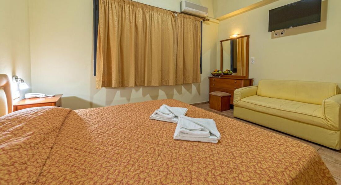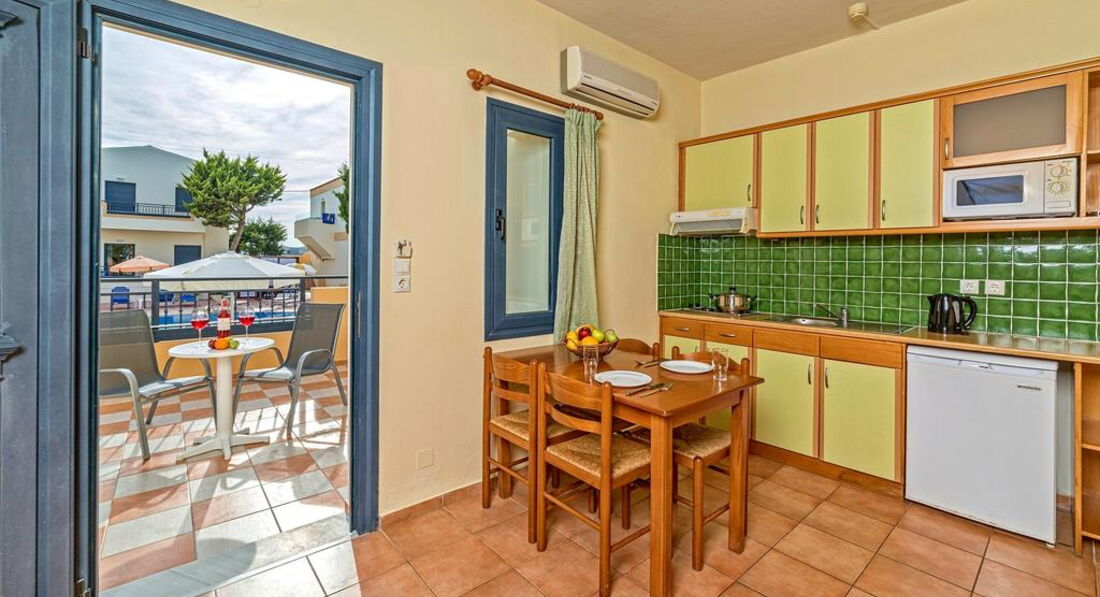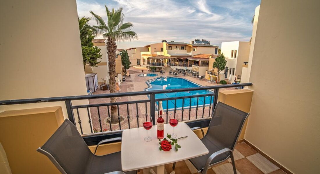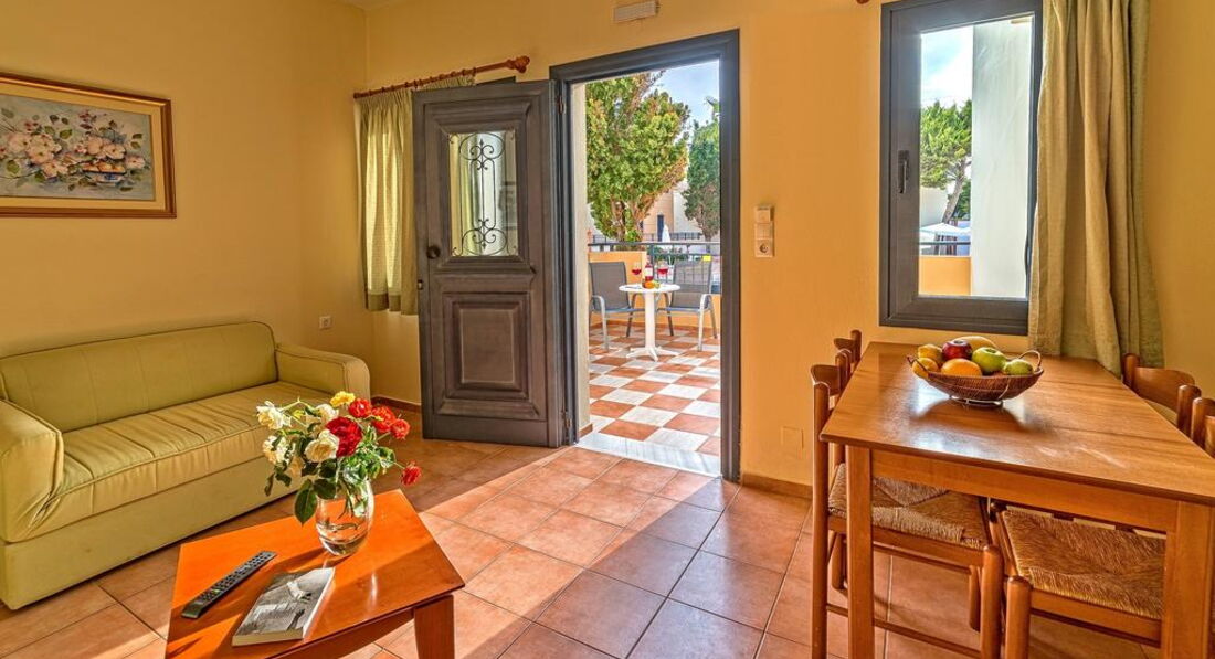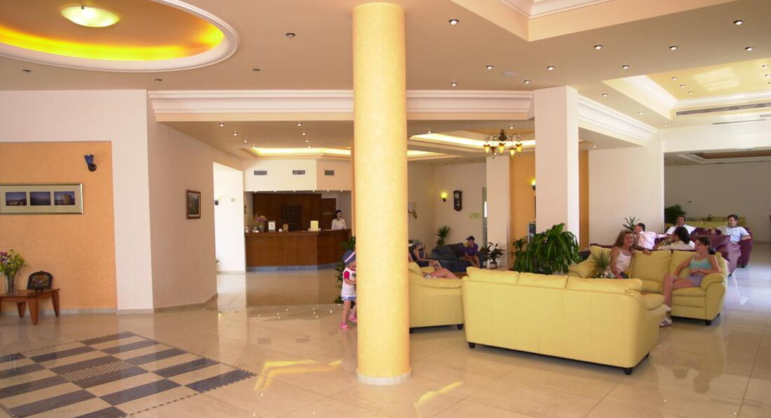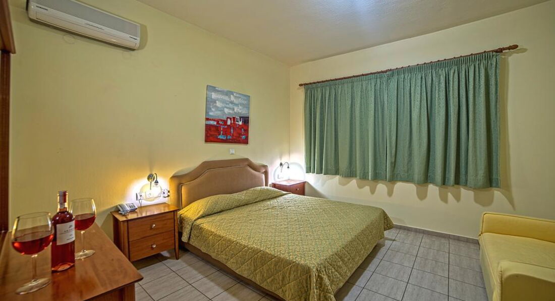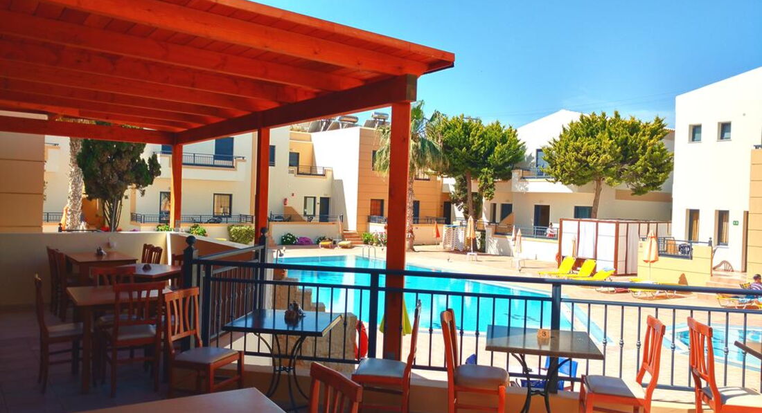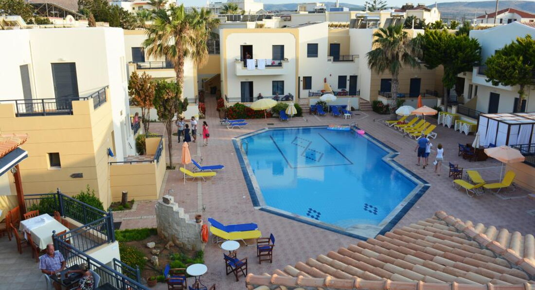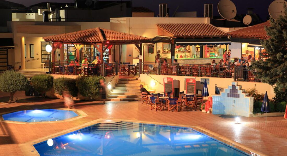 А-ля карт ресторан пропонує широкий вибір страв, включаючи традиційний англійський сніданок, грецькі страви, італійську та інтернаціональну кухню. Готель радий запропонувати пакет із семи страв з великою кількістю опцій. Кожному члену сім'ї пропонується: Будь-який сніданок Обід або вечеря з меню Закуска Малий салат Друга страва Десерт Келих вина або безалкогольного напою Дана пропозиція дійсна протягом семи днів, не обов'язково поспіль. Крім того, включено витрати на піцу, традиційний критський вечір та барбекю. Пляж: піщаний пляж парасольки: платно шезлонги: платно