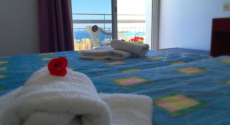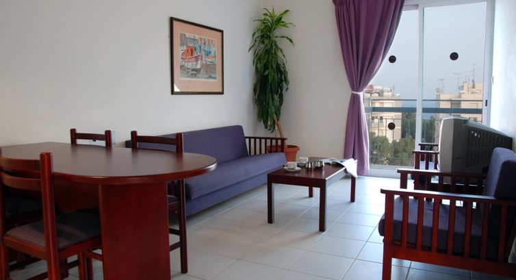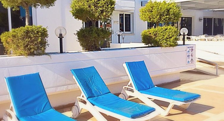Очень неплохой отель. Номер с кухней, гостиной и спальней. Кухня полностью оснащенная, в том числе холодильником, чайником, плитой, посудой. Поэтому с легкостью забронировали отель без питания, когда узнали, что есть кухня. С продуктами проблем не будет, в магазинах рядом все есть. Иногда ходили в таверны. Море через дорогу от отеля, пляж муниципальный, лежаки за деньги. Пляж хороший, чисто, также как и море. Понравилось, что есть где погулять, можно съездить в порт, в зоопарк, погулять по набережной.