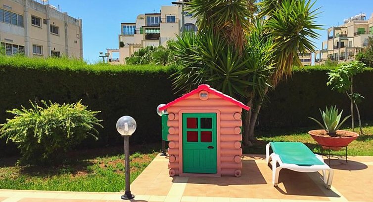 Бассейн нормальный. Вода чистая. Люди пользуются. Рядом - единственное развлечение для малышей - небольшой домик в удовлетворительном состоянии с открывающимися ставнями и дверью.