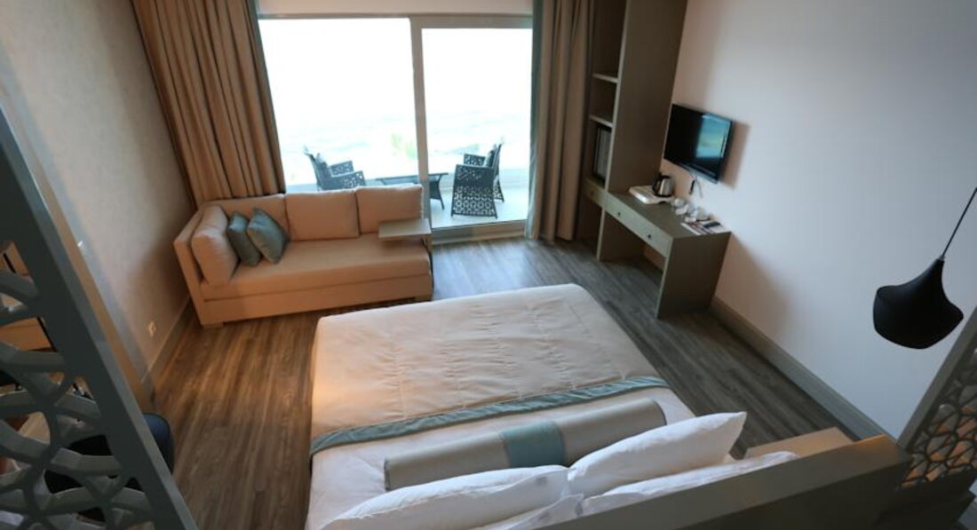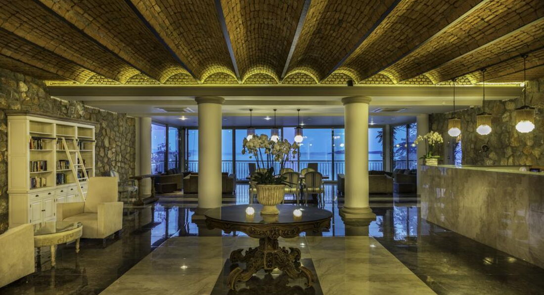 Побывав в различных отелях мира,хочется сказать,что это место заслуживает особого внимания. Отель имеет огромную территорию,природа очень живописна. Для любителей фотографии это настоящий рай. Море имеет удивительно сине-бирюзовый оттенок. Оно прозрачно,очень чистое. Прозрачный лифт с лёгкостью вас спустит к пляжу. Единственный минус-всегда оно несколько прохладно. Песка нет. Галька. Есть несколько заходов в море,так что это не вызовет трудностей.