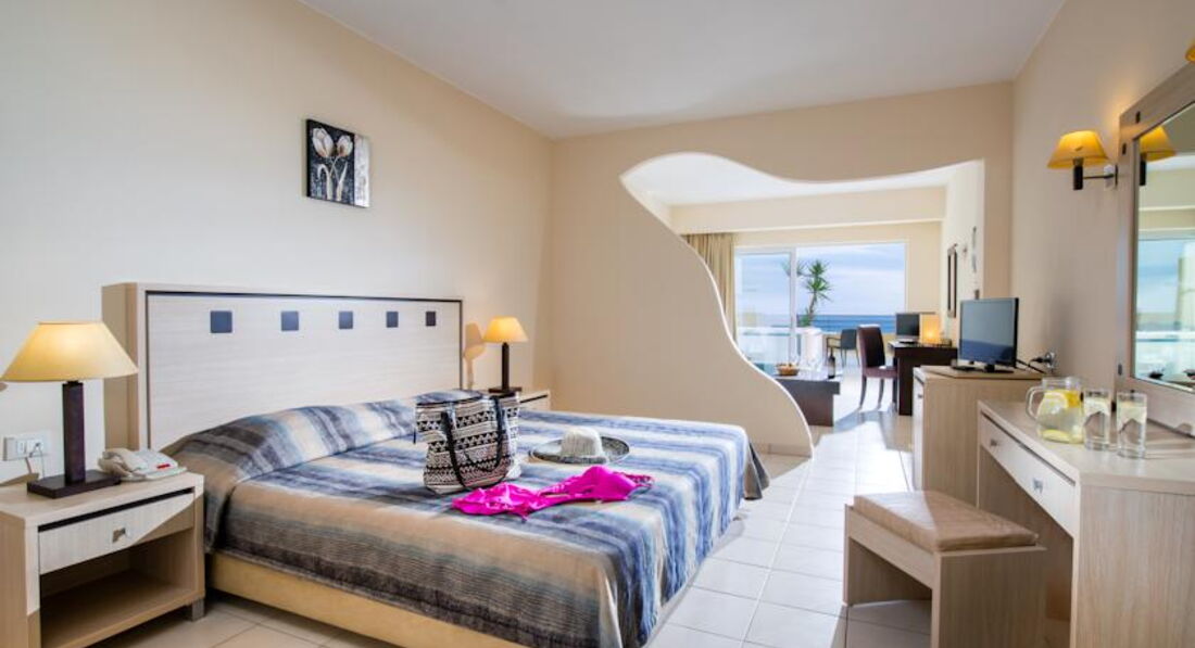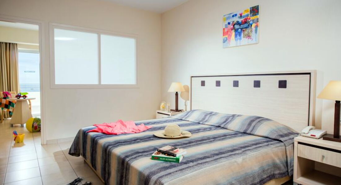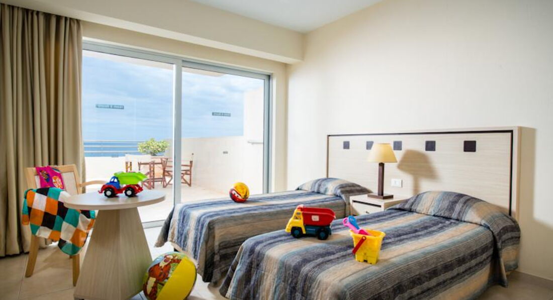 family sea view (вид на море, 2 спальні з дверима, осн. ліжко – 2 односпальні, дод. – 2 односпальні ліжка, макс. 3+1 чол., 40–45 м2), є кілька номерів без дверей, з перегородкою;