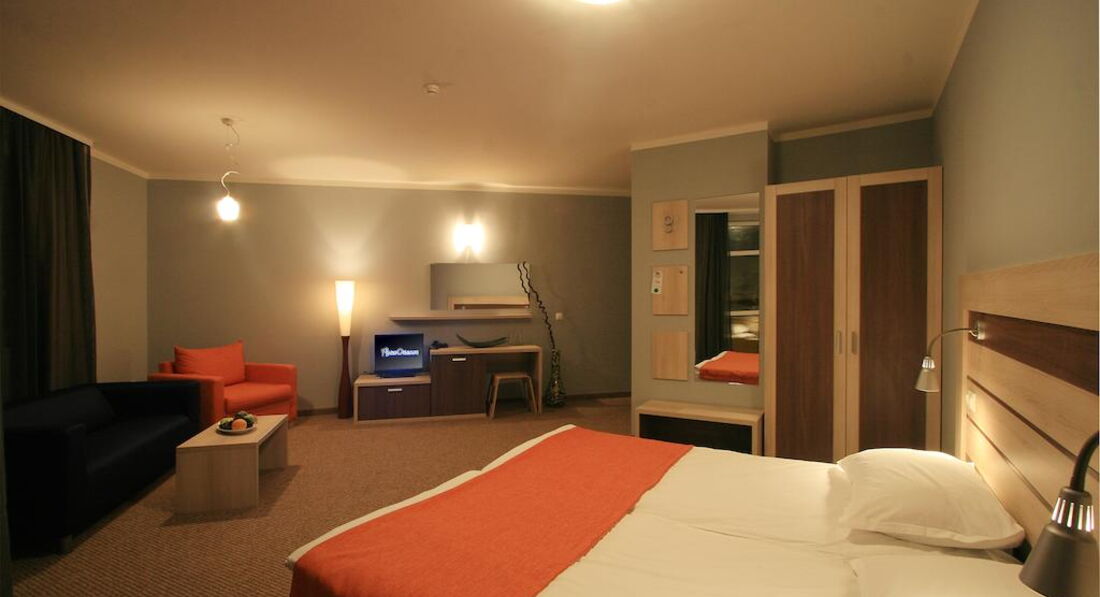 Studio – одне приміщення з двоспальним ліжком або двома односпальними ліжками, розкладним кріслом та диваном, для другої дитини надається розкладачка з матрацом, макс. 2 дор. + 2 дит. або 3 дор., 31 м2;