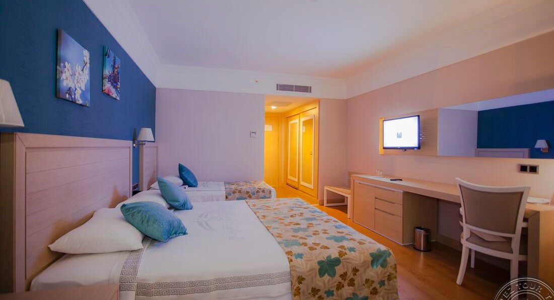 Одна из наших туристок даже на обед в отель не ходила- хватало еды на пляже. Отель все-таки для взрослых, мамочкам с маленькими детьми не сюда. На шведском столе было все- от каш до шашлыка. Были и фрукты, и овощи и арбузы каждый день , цитрусовые, персики, абрикосы, клубника.Очень вкусные коктейли в баре. Алкоголь нормальный. Много иностранцев. Отношение хорошее, что к иностранцам, что к нам. Номера большие, к двуспальной кровати еще и диван стоял и еще одна односпальная кровать. Проживали в номере вдвоем. Очень качественная уборка- мы жили во втором корпусе на втором этаже (номер 2210). Женщина, убиравшая у нас в номере - хочется выразить ей огромную благодарность - убирала чисто, качественно, постояннго меняла полотенца. В день, когда у нее был выходной и убирался кто то другой- было и не заметно, что была уборка. До пляжа ходил автобус 2 минуты. Постоянно туда- обратно. Каждые 15 минут. А впрочем и пешком все рядом. Если не хотите прибавить за неделю 3 кг, ходите пешком! Море чистое, пляж песчанный, хороший, широкий,чистый.Заход в море пологий. Лежаков хватало. Сотрудник в желтой футболке оперативно приносит матрасы, очень дружелюбный. После рабочего дня он мыл все лежаки и столы Отдых отличный, рекомендую!