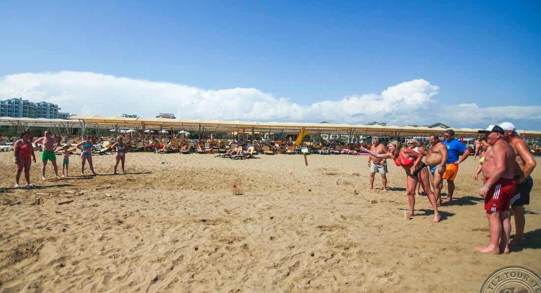 Басик ходит часто (чаще, чем указано в расписании – это плюс), водители (их 2, меняются) всё такие же вежливые, по дороге наших подбирают, перед обедом и вечером (в 18:00 последний выезд до отеля) народ с пляжа созывают, чтоб, кому надо, не пропустили поездку))) На пляже есть бар-ресторан, можно напитки взять и покушать, кому не хочется обратно на обед в отель, правда, пиццы что-то не было. Есть холодильники с водой в баночках и на пляже и у бассейнов, похожи по виду на ниши йогурты, удобно, как стаканчик, можно брать спокойно. Есть душ, кран для ног, переодевалка и туалет (за ним бы лучше приглядеть, не всегда чисто и в этот раз темно там как-то), много урн, к сожалению, ими отдыхающие не всегда пользуются. Лежаки под длинными тентами, матрасы приносит парень на пляже, но если много народу, мы сами брали, чтобы не ждать (правда, было это сейчас всего 1 раз, он очень шустрый, сразу видит новеньких, может за раз штук 10 принести). Песочек отличный. Заход - постепенный, песочек, бывает полоска гальки с камнями небольшими сантиметров 70, но, когда волны, всё уносит в море. Ракушек в этот раз было немного, зато волны были отличные, катались на них с удовольствием, и дети тоже. Тут большая пляжная полоса, есть, куда прогуляться. Места были всегда, правда, первая линия всегда занята, но это не критично, расстояние между рядами лежаков приличное, можно спокойно лежаки за солнцем двигать. Море в сентябре шикарное, тёплое при тёплое, выходить не хочется, но очень жарко, обязательно мажьтесь кремами защитными, и лучше с 11 до 16 в теньке быть, чтобы отпуск не испортить, а то как мы)))), дорвёмся до моря, потом красные и облазиваем)))) Муж в волейбол играл, у них там своя команда образовалась, так они каждый день и играли, площадка удобная, есть шланг, чтобы песок полить перед игрой, мяч можно у аниматоров взять.