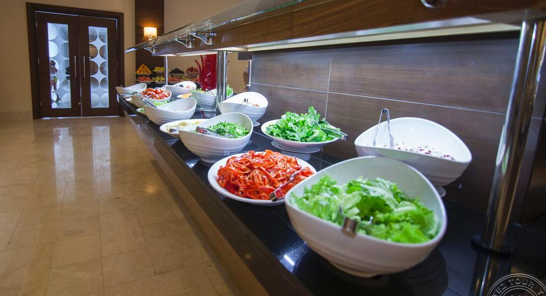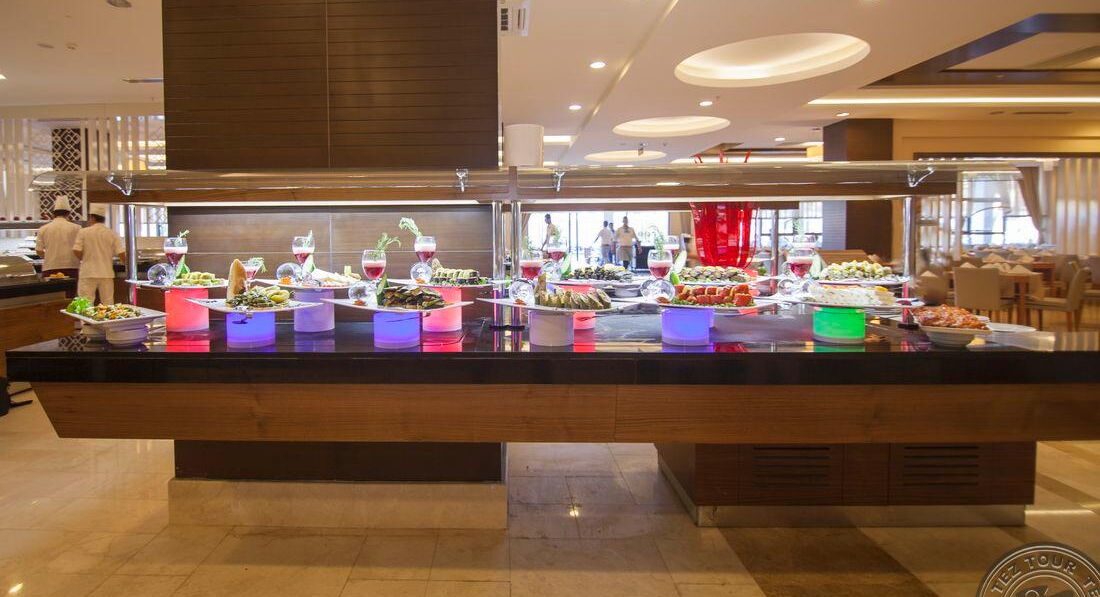 Сніданок (07:00-09:30), пізній сніданок (09:30-10:30), обід (12:30-14:00), вечеря (19:00-21:00), пізня вечеря (23: 00-00:00) – шведський стіл; закуски протягом дня в барах готелю. Алкогольні та безалкогольні напої місцевого виробництва.