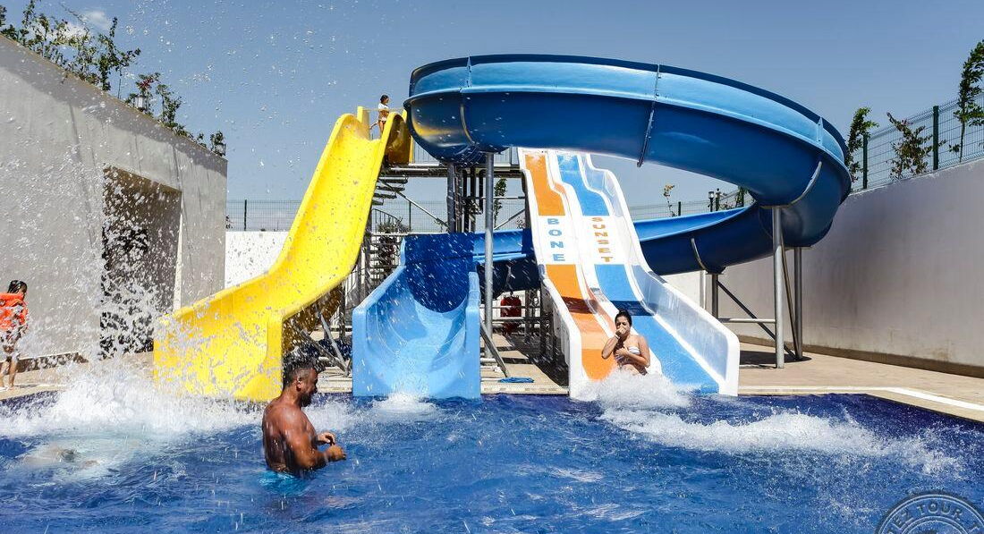 Территория отеля это большой бассейн, поделенный на несколько зон. Есть лягушатник, аквапарк ( 3 горки, скорее детские, хотя взрослые с удовольствием гоняют ), и сам бассейн, метров около 50 длиной. За углом 3 корпуса есть еще один. Даже в августе там очень прохладно и толкучки нет.