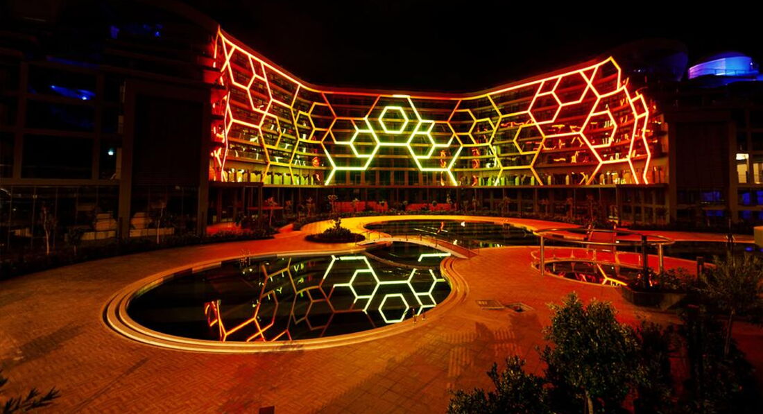 Отдыхали в этом отеле с 16 мая по 26 мая 2017, приехали днем, нас сразу разместили, дали номер на 6 этаже с видом на бассейн и море. Номер очень красивый, уютный, чистый, мягкие кровати, белоснежное белье, телевизор,мыльно-рыльные принадлежности были, санузел в стеклянном стиле, все было оригинально. Отель очень шикарный, ухоженная территория, все чисто, побывав в этом отеле, окунетесь как в сказку. Отель был сделан в виде сот, а вечером и ночью очень красиво переливался, отдыхающие проходящие мимо нашего отеля разглядывали его и восхищались. Еда в ресторане была вкусная, разнообразная, было много фруктов, мороженое, мясо, рыба итд, персонал везде очень приветливый, на все интересующие тебя вопросы, спешат с улыбкой на лице ответить. Что касается анимации, то она была через день, мы ходили на африканское шоу, ребята акробаты, так здорово выступали, что дух захватывало. Пляж и море чистое, единственное, что заходишь в море, 2-3 метра и глубоко и хотелось бы побольше анимации, все таки в отеле отдыхает много молодежи. Выражаю благодарность хозяину отеля и заботливому персоналу. Отдых удался обязательно еще вернемся сюда.