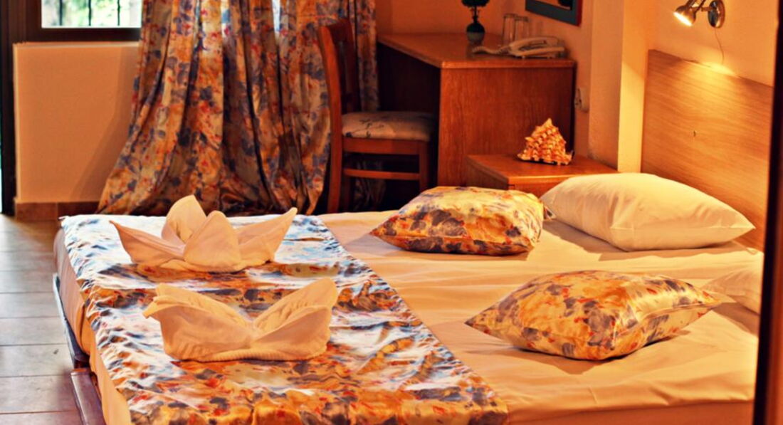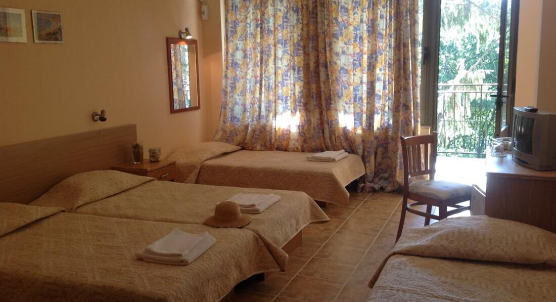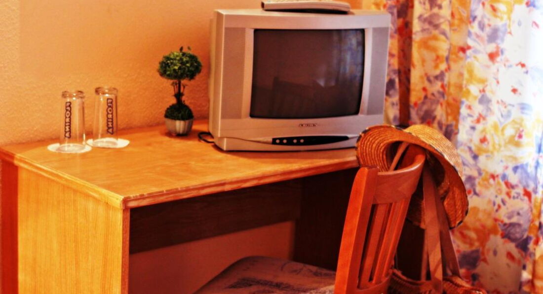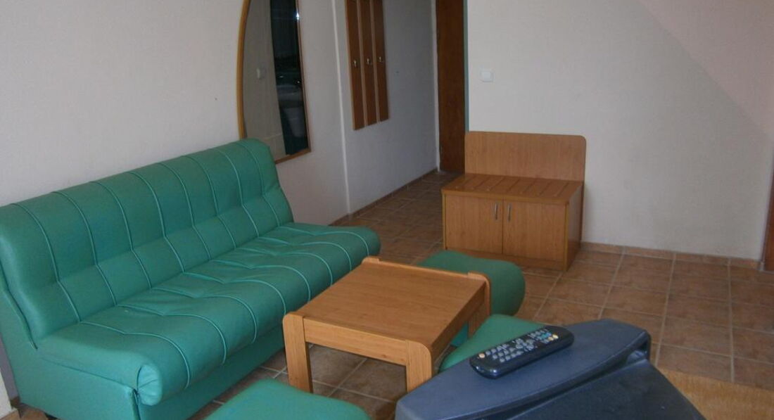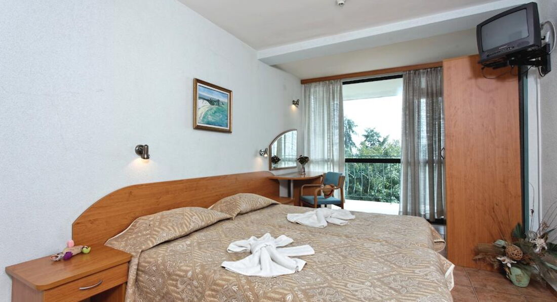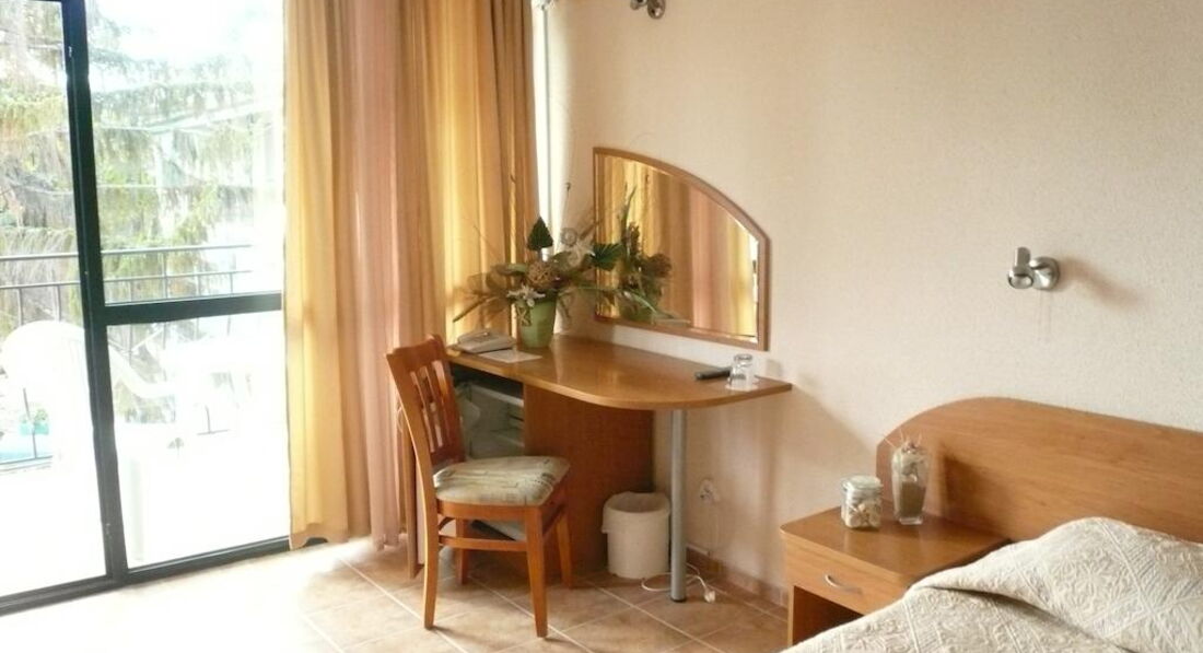 Ездили по горящему туру в июне 2015 года. В целом, отель полностью устроил, т.к. из Аэропорта Варны он первый на курорте, куда нас завезли (не пришлось ехать по всем отелям). Мебель в номерах старая (у нас окна выходили в сторону моря, третий этаж, сосны), но сантехника в среднем состоянии. Большие балконы, кровати не очень удобные (и было 2, вместо одной большой), но спать можно. Убирались каждый день. Телевизор есть, но старенький, многие русские туристы смотрели по вечерам (каналов русских полно). В лобби бесплатный интернет, который на удивление очень хорошо работал, за доп.деньги можно подключить и будет в номере.