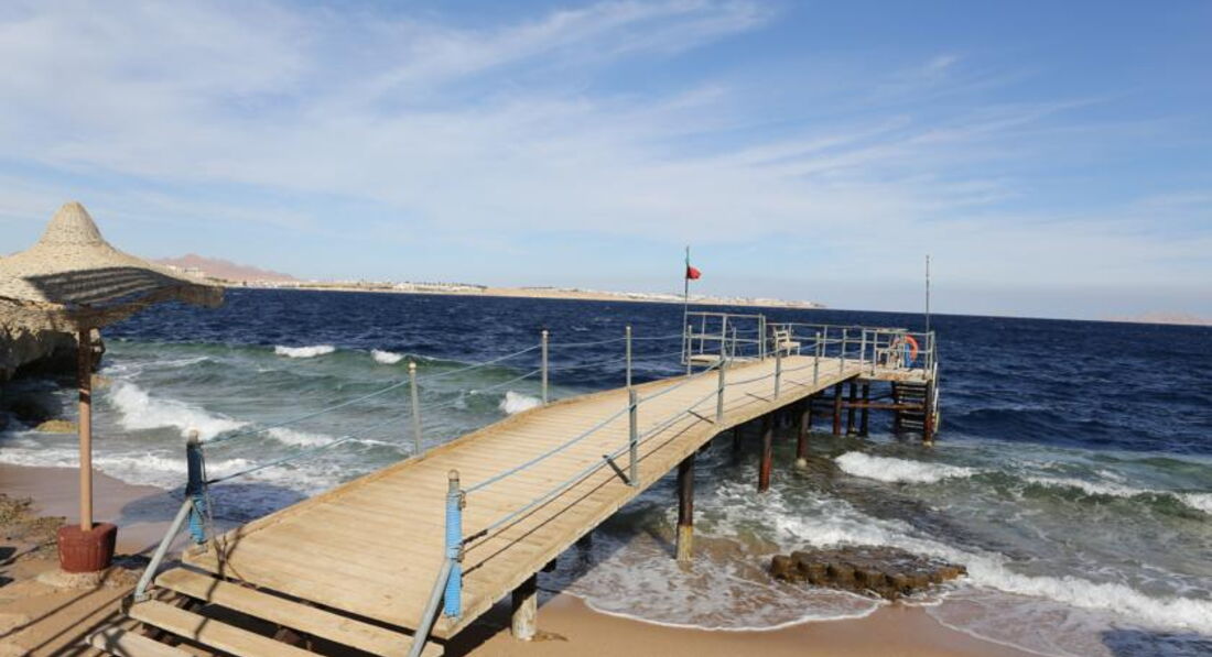 МОРЕ И РИФ. Пирс удобный. Всегда красный флаг. Даже в штиль))). Я так понял, что администрация отеля снимает с себя обьязательства за безопасность.
