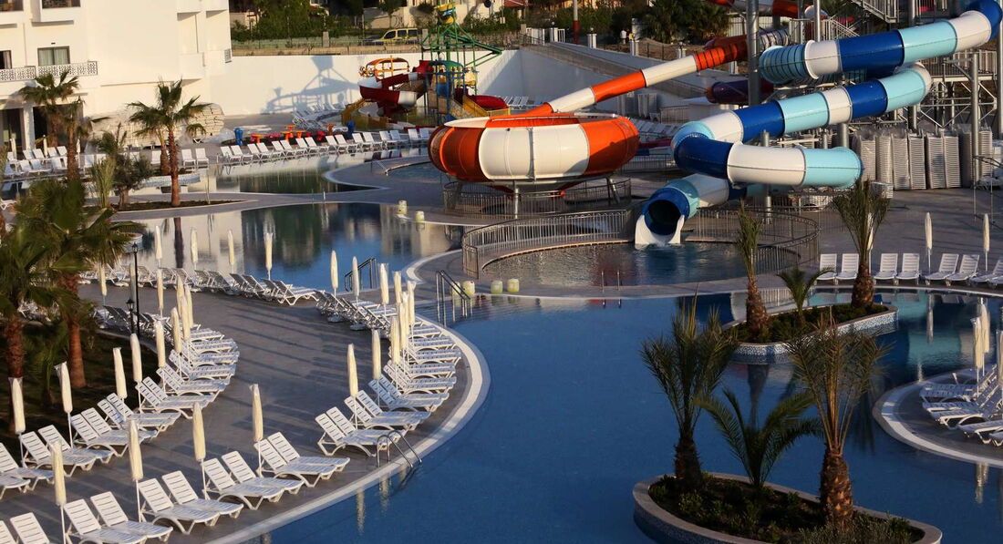 Бассейны: занимают большую площадь, шезлонгов всем хватало даже при полной загрузке отеля, аквапарк очень классный, но на унитазе кататься страшновато, хотя мы катались. Детский бассейн с горками: неплохой по задумке, но вода в нём холоднее, чем во взрослом, было бы комфортнее, если вода в ведро наливалась потеплее. Также не совсем понравилась детская площадка, она маленькая, находится где-то в закутке. На такое количество детей нужно что-то посущественнее.
