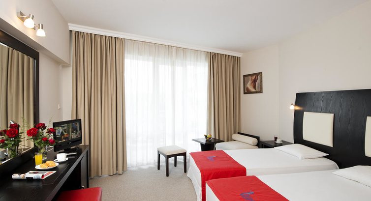 Сразу скажу, всем довольны, отдохнули на ура, теперь фитнес нам в помощь после такой объедаловки там))))Отдыхали компанией из 6 взрослых и 2 детей в этом отеле в июле 2015 г. Прибыли в отель около 22-00, на ресепшн нам сразу вручили сухой паек и разместили в номера. номера чистые, мебель приличная, не новая, но вполне себе приятная. На следующий день были приятно удивлены разнообразием еды (овощи, паста,картофель, мясо на выбор: телятина,свинина,курица, всегда есть рыба в разных исполнениях, салаты, овощи, выбор фруктов не очень большой, но это не беда, сладости). на обед особенно хорошо шли супы, которые приближены к русской кухне и очень вкусны. По средам угощают ракией и невероятно вкусной уткой, выступают артисты местного ансамбля песни и пляски в народных одеждах))) Детям особенно нравилось после обеда бежать за мороженым, которое там в разных вкусах предоставляется по системе все включено в неограниченном количестве. Папам этих карапузов очень нравилось бежать к бару за пивом и пр.напитками, и скажу я вам, очень не дурного качества. Есть детская комната, но в основном там с детьми просто присутствует аниматор, дети развлекают сами себя, наши племяшки вполне были удовлетворены тем, что там можно просто сидеть и рисовать))) Вечераи в лобби проводятся развлекательные мероприятия с клоунами. До моря идти минут 7, мимо магазинов, в которых можно купить все необходимое (как в типовом курортном городе). пляжи все муниципальные, народу не мало, но есть платные зоны, где можно арендовать шезлонг и зонтик. вечером ходили гулять в город, там есть и батуты большие для детей и разные всевозможные аттракционы. на паровозике можно съездить в старую часть города, где есть рестораны на берегу моря с необыкновенно красивым видом, а также в удовольствие просто погулять и посмотреть на местный колорит жителей. В общем главное с собой на отдых брать отличное настроение и тогда море положительных эмоций вам обеспечено!!!!