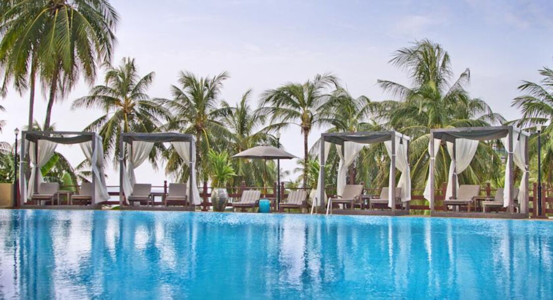 Очень хороший отель, с огромной территорией, до моря минут 5 ходьбы, есть фуникулёр до пляжа (как мини-вагончик на рельсах). Ярко выражены приливы и отливы. Номера большие, хорошие, с огромными кроватями, халат, тапочки есть. Завтраки просто шикарные, можно объесться всего-всего (мясо, сосиски, амлет, овощи, фрукты и мн.др.). Молодёжи делать нечего, если только компанией, одному будет скучно. По вечерам играет живая музыка в ресторане у бассейна. Выйти из отеля некуда, но надо учитывать что это Панва.