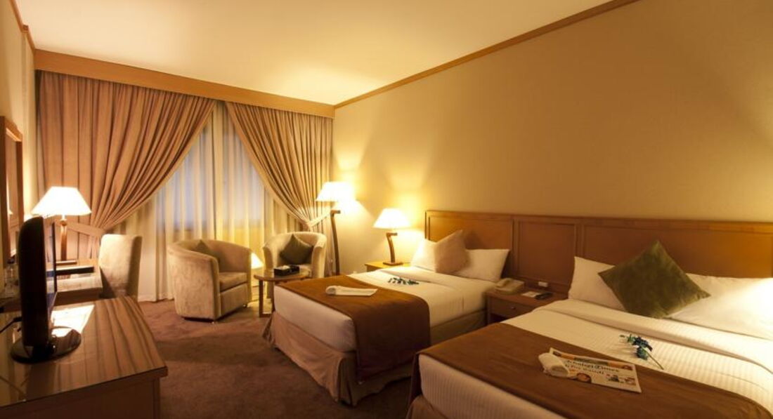 Отель нам не понравился. район очень шумный (круглосуточно). рядом находятся аттракционы (от них визг и шум от каруселей), шумоизоляция плохая. Рядом стройка-начинает работать рано утром. улицы узкие - машины сигналят и днем и ночью. в отеле есть тараканы. номер довольно таки просторный. два кресла, телевизор, кровати. один канал на русском (первый). Много русских туристов. питание не понравилось . брали завтрак и обед (обед можно менять на ужин). На завтрак - кофе, чай, оладьи с джемом, сендвичи, иногда была нарезка из одного вида колбасы, один вид сока, каша, салаты - вариации из свежих помидоров и огруцов, картошка, рис, сосиски. Из фруктов - всегда только один арбуз, из сладостей - желе и мусс. на обед добавлялись суп, рыба, курица. Общались с другими туристами из отеля - всем питание не понравилось. на тройку. четверке не соответствует. постельное белье за неделю ни разу не меняли. если для экскурсий - то отель находится далековато от всех достопримечательностей. Были до этого в четверке в дубай (где финанс. центр) - по уровню - небо и земля. Бассейн обычный (лежаки всегда есть свободные) вода слегка подогревается. На пляж трансфер бесплатный в девять утра (забирают по моему в 12), бесплатный автобус до Дейра сити мол (через 2-3 часа).