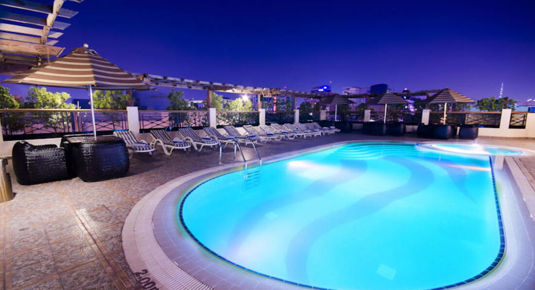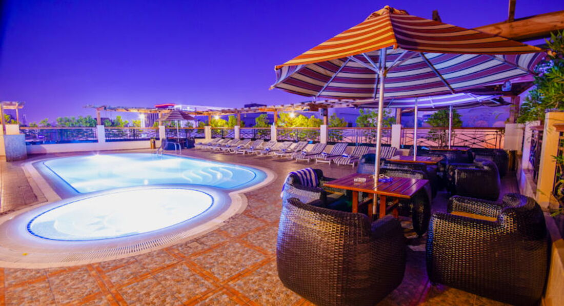 На крыше отеля находится подогреваемый бассейн,но лежаки там занимают часов в 7 утра. Перед бассейном можно взять полотенца,которые записывают на вашу фамилию,а в течение дня вы их должны вернуть. Так же есть бесплатная сауна,но надо заранее попросить чтобы ее нагрели. Есть хорошо оборудованный спортивный зал. Утром в определенное время ходит бесплатный автобус на пляж,автобус уходит и приходит в точно назначенное время. Вход на пляж-5 дирхам. Пляж чистый,но лежаки платные-15 дирхам. Экскурсии лучше всего покупать на пляже у фирмы " Алладин",потому что в отеле они почти в два раза дороже и хуже.