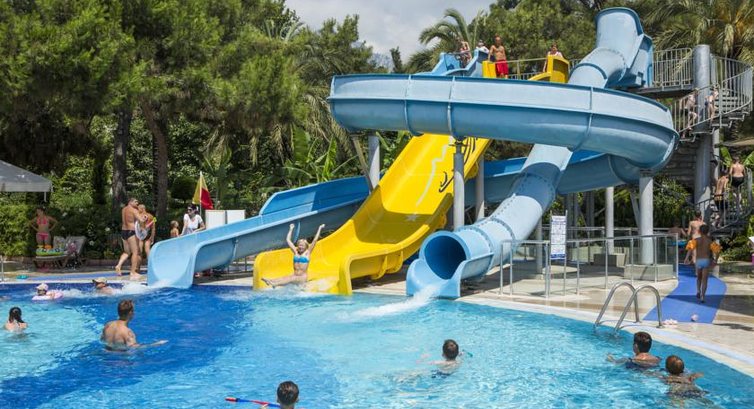 - На территории отеля расположена 2 бассейна, один маленький детский и основной бассейн с 3 водными горками.