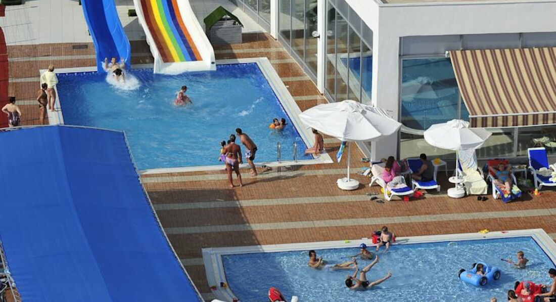 Есть большой бассейн, детский, бассейн с двумя горками, крытый с подогревом средний бассейн и детский.