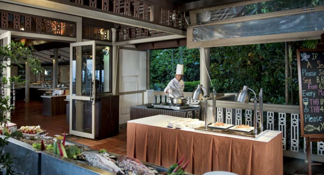 В отеле просто шикарный ресторан, кормят потрясающе! А вид такой, что дух захватывает! Покушать в нем на двоих с вином и морепродуктами стоит около 2000 бат. Если выходить в город, то получается дешевле, но не так вкусно! В городе покушать на двоих со спиртным стоит от 500 бат до 1000 бат.