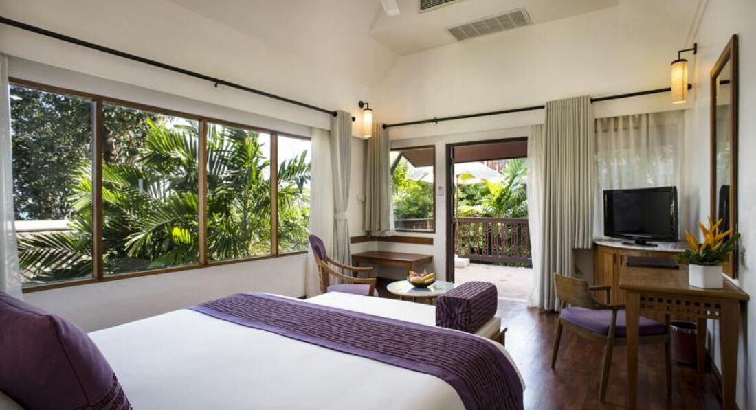 Каждый номер представляет из себя отдельный домик-виллу, что позволяет жить в уединении от соседей в окружении тропической зелени. Номера красиво оформлены, имеются сейф, холодильник, кондиционер+вентилятор, душ, телевизор. Обратной стороной того, что территория отеля представляет собой джунгли, являлось наличие в нашей вилле двух ящериц и, что ещё менее приятно, одного крупного паука, которого мы в конечном счёте отловили и выпустили на улицу. Как и во многих других тайских отелях, воду в душе очень трудно отрегулировать на нормальную температуру: она норвит потечь либо слишком холодной, либо слишком горячей. Электророзетки сильно разболтаны. В остальном к номерам претензий нет, убирались регулярно и очень хорошо.
