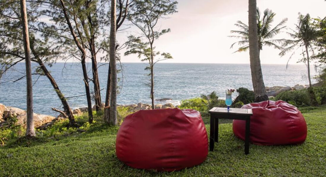 Отель расположен в бухте Карон, а точнее он замыкает эту бухту. Находятся он на холме, состоит из вилл, если вы хотите виллу обязательно с прямым видом на океан, значит надо брать обязательно номер с бассейном или джакузи, только они располагаются на первой линии каменистого пляжа, с которого надо заметить купаться невозможно! Но от этих вилл далеко до ресепшена, подниматься надо по многочисленным лестницам, это надо учитывать при бронировании туристов с детьми, ограниченными возможностями и пожелых пар!Также по территории ходит кар на котором можно перемещаться то территории отеля, но он ходит также не везде! Территория отеля очень зеленая, большая, красивый бассейн и зона сада, великолепный вид на Адманское море практически из любого места!