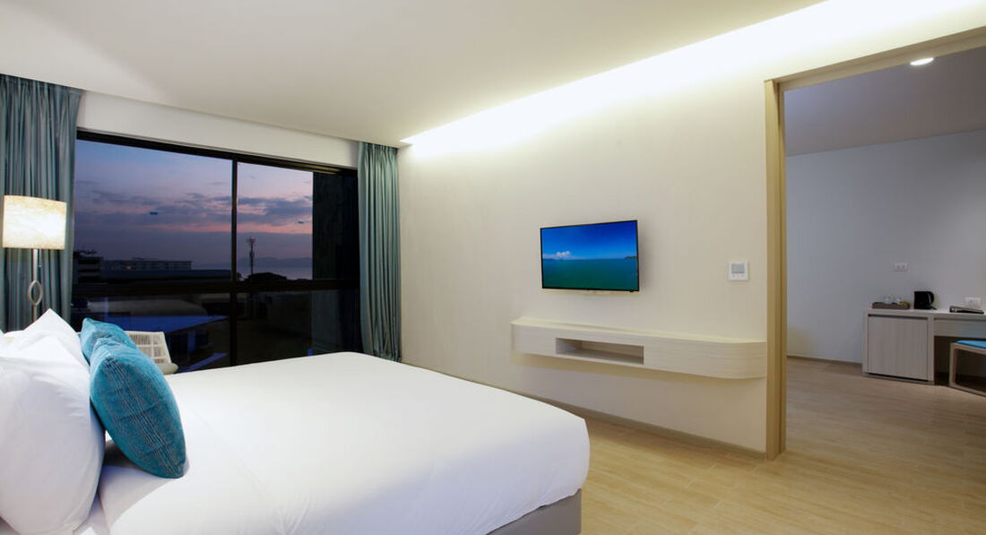В номере всё новое (т.к.отель новый), светильники, мебель, дизайн : замечательно. Выключатели и розетки Битичино (я торгую электрикой и была очень удивлена, т.к. это дорогущая фирма),сенсорное управление сплит-системой. Фен, чайник, чашки, стаканы, сейф, небольшой холодильник в номере есть.Телевизор плоский на стене закреплён(смотреть было некогда, поэтому не знаю на счёт каналов). Каждый день горничные пакетики чая и кофе оставляли , ставили новую питьевую водичку в стеклянных бутылках (эти бутылки выбрасывать нельзя. Просто пустые на видном месте оставлять). Балкон большой, по вечерам можно там вести беседы под пиво))). Ксате ,на территории отеля пиво и др.спирт .напитки (свои) пить нельзя. Хотя в тёмное время суток парочки на лежаках с бутылками пива отдыхали и всё норм. Вай-фай ловит на территории всего отеля, но на рецепшене лучше всего , днём очень слабо. Фото в соц-сети только поздно вечером загружалось. Питание нам понравилось. Хлеба, булок,кексов много.Супы 2 вида, рис 2 вида, сосиски, бекон , омлет, несколько видов тушеных овощей с мясом, овощи сыр. В общем много всякой всячины. Много непонятных салатов, приправ, но нам было интересно – всё пробовали. Что- то не нравилось из их местных блюд. Но это уже дело вкуса. Мы всегда были сыты и довольны. Пищеварение в норме.(но на всяк случай т.к. мы в отеле только завтракали ,а обедать и ужинать приходилось в городе, то для профилактики пили активированный уголь и Смекту.) Фрукты давали : дыню, арбуз,ананас , папаю, драконов фрукт.Один раз были маленькие бананы. Чай кофе, соки, молоко тоже у них есть. С 8 утра и до 8 вечера трансфер на пляж. Но не каждый час. Расписание в микроавтобусе висит.А также 2 раза в день возят в торговую зону Патайи. Рекомендую хорошенько запомнить место откуда он вас потом будет забирать(там же куда и привёз). Мы в первый раз опростоволосились и пришлось с пляжа в отель возвращаться пешком((( тяжеловато…. Кстате , в этом месте где вы ждете трансфер с пляжа магазин «7-11» ( севен- илевен) и перед входом в него торгуют шортами , футболками и прочим. Так вот я там купила сумку за 100 бат, а везде , в том числе и в торговых центрах она стоит 200 бат!!! Рекомендую.