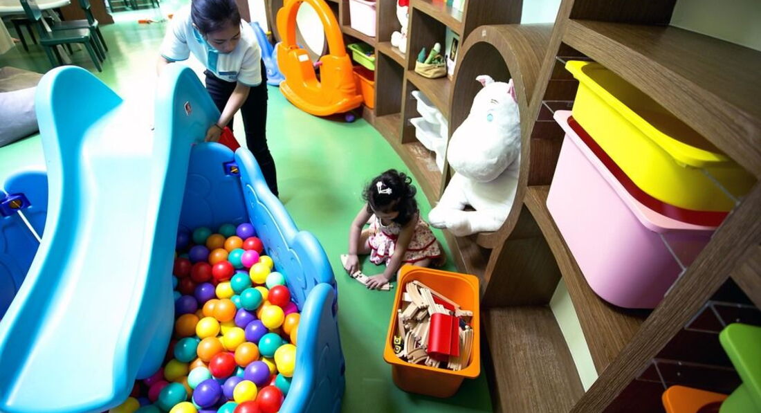 Детская комната с балкона выглядит как белый полуподвал с круглыми люками в крыше( мы сначала думали что это прачечная)))). Там всё расчитано на малышей. Всё маленькое горка с мячиками, микрокачельки, зато аж три телека и по всем одновременно один и тот же мульт. Столики с карандашми и разукрашками, детский туалет. Всё.