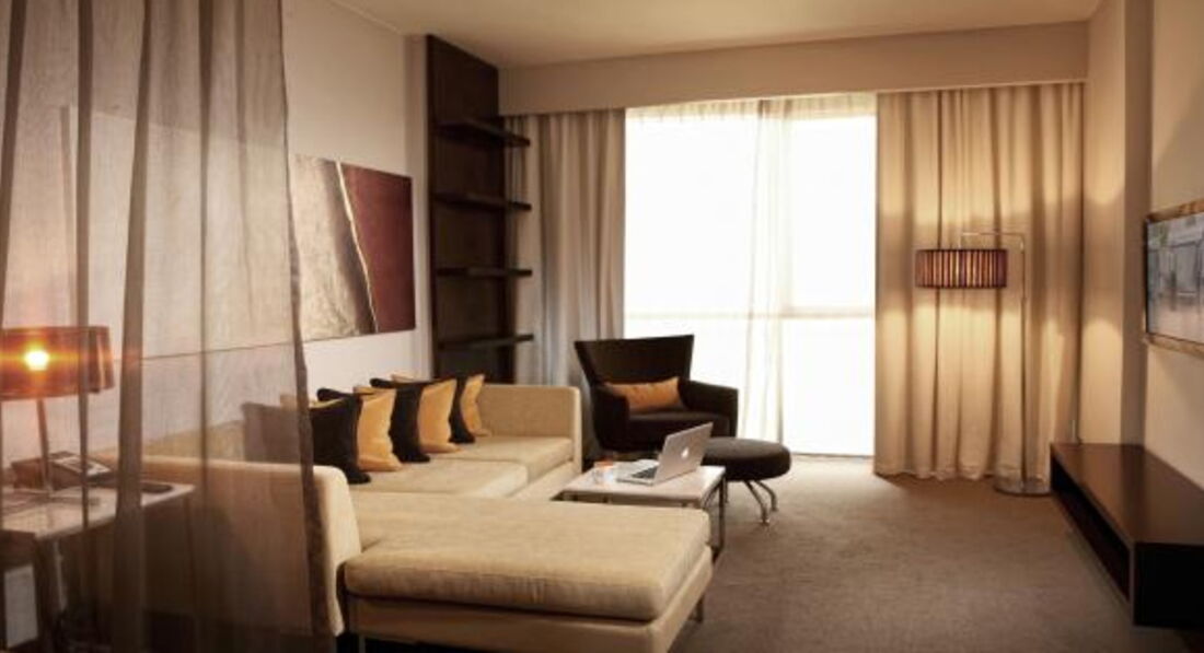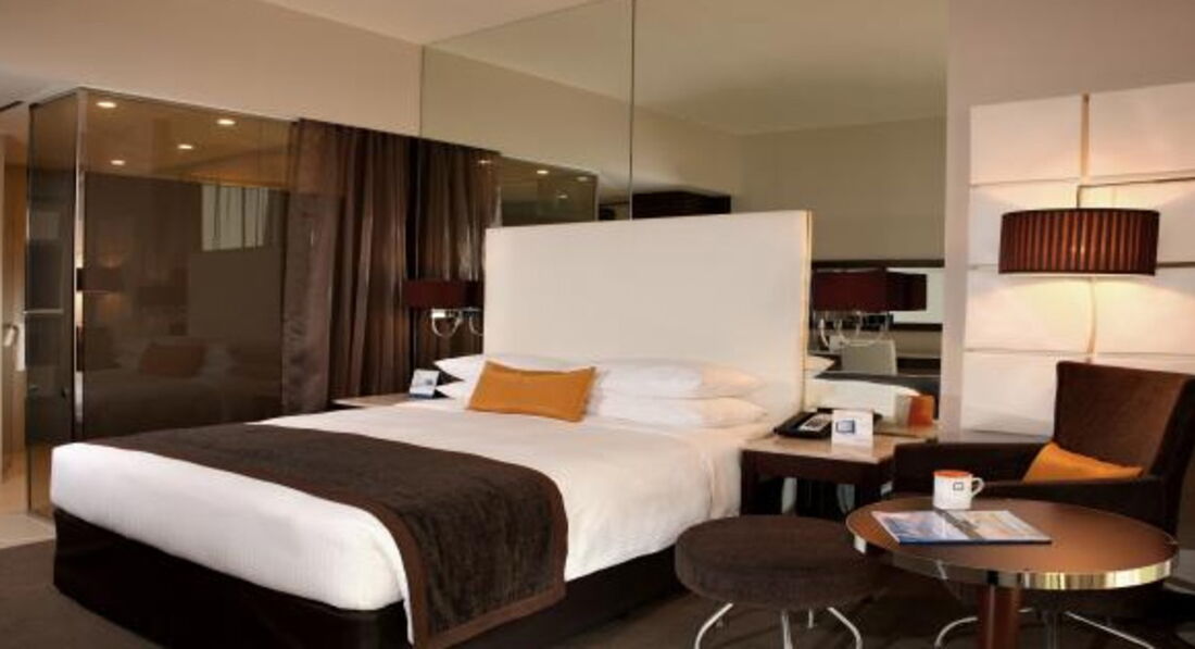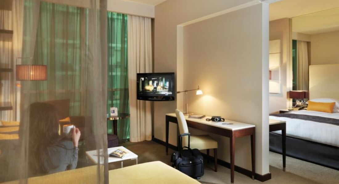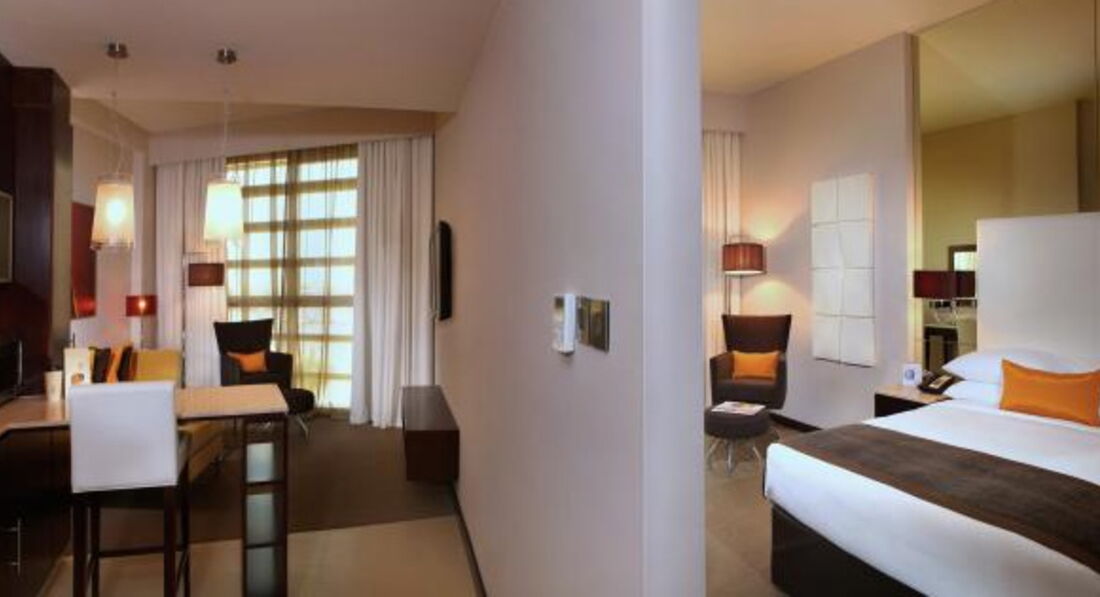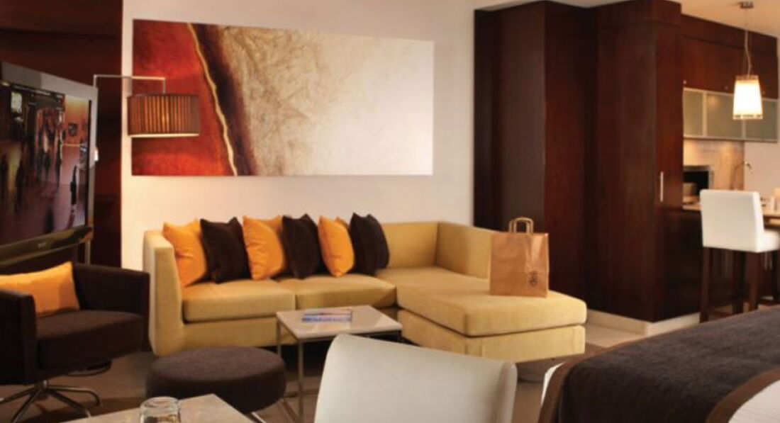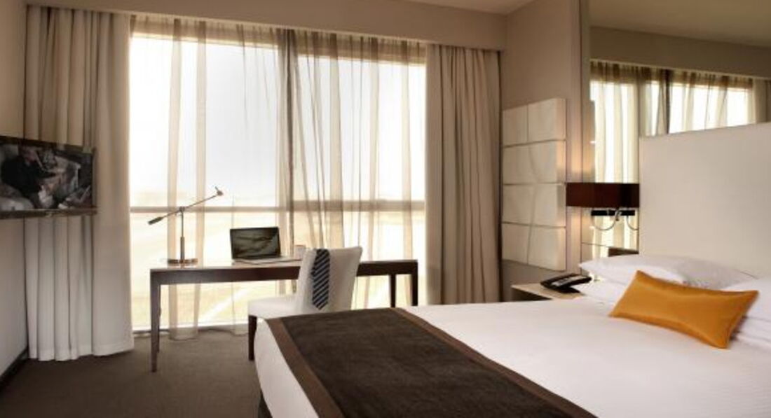 4 One Bedroom Suite без Extra Bed (50 м2) Зміна білизни: щодня. Спальня та вітальня, є міжкімнатні двері. Вид на вулицю / аеропорт. 1 двоспальне ліжко (queen-size). Прибирання номера – щодня, зміна білизни щодня.