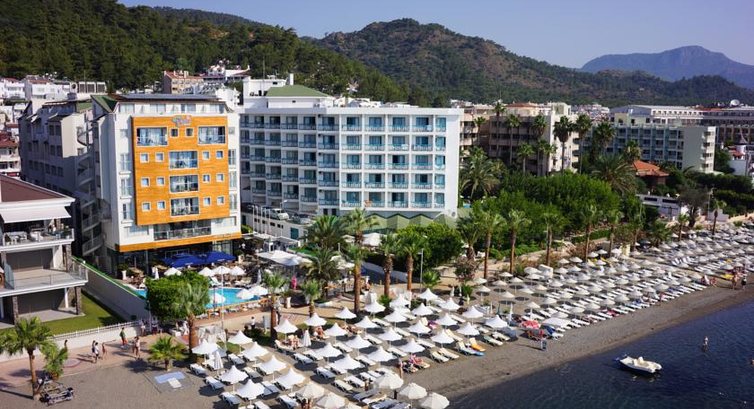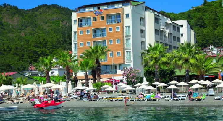 Рекомендую этот отель!Мы остались очень довольны!В отеле всегда свежее и разнообразное питание(на любой вкус,всегда был выбор,что скушать,много мяса,свежих овощей и десертов),приготовлено оочень вкусно!Нравилось,что был поздний завтрак- до 10 часов, потом до обеда можно было перекусить в баре около бассейна, в 15.00 у них раздают мороженое, а где-то с 18.00-19.00 коктейли.В обед развлекательные программы в бассейне (волейбол и еще прикольные конкурсы),вечером живая музыка(девушки очень красиво пели),еще было фаир-шоу и игры Бинго.В отеле приветливый персонал,приятно с ними общаться,всегда вежливые,улыбаются,спрашивают как дела и тд.Единственное,что персонал разговаривает на английском,на русском практически не говорит,но это не составило проблем))Все друг друга прекрасно понимали,хотя у нас с мужем далеко не идеальный английский.Русских было только 2 пары,но нам это очень нравилось))В основном там европейцы.Расположение отеля замечательное,на берегу моря,проблем с лежаками не было,всегда были свободные.Экскурсии покупали на улице,если стоять спиной к отелю, агенство находится чуть левее через дорогу,называется BALCIBAY.Там работают Махир и Юля,очень приятные молодые люди,предложили действительно интересные экскурсии!Цены у них гораздо ниже,чем в отеле, а по качеству ничуть не хуже.У них же брали велосипеды напрокат,катались вдоль пляжа. Набережная дорога очень длинная, протяженностью около 9 км, соединяет центр Мармариса с Ичмелером (соседний курортный городок).Вид потрясающий! Было здорово!До центра Мармариса добирались на маршрутках(ходят очень часто).