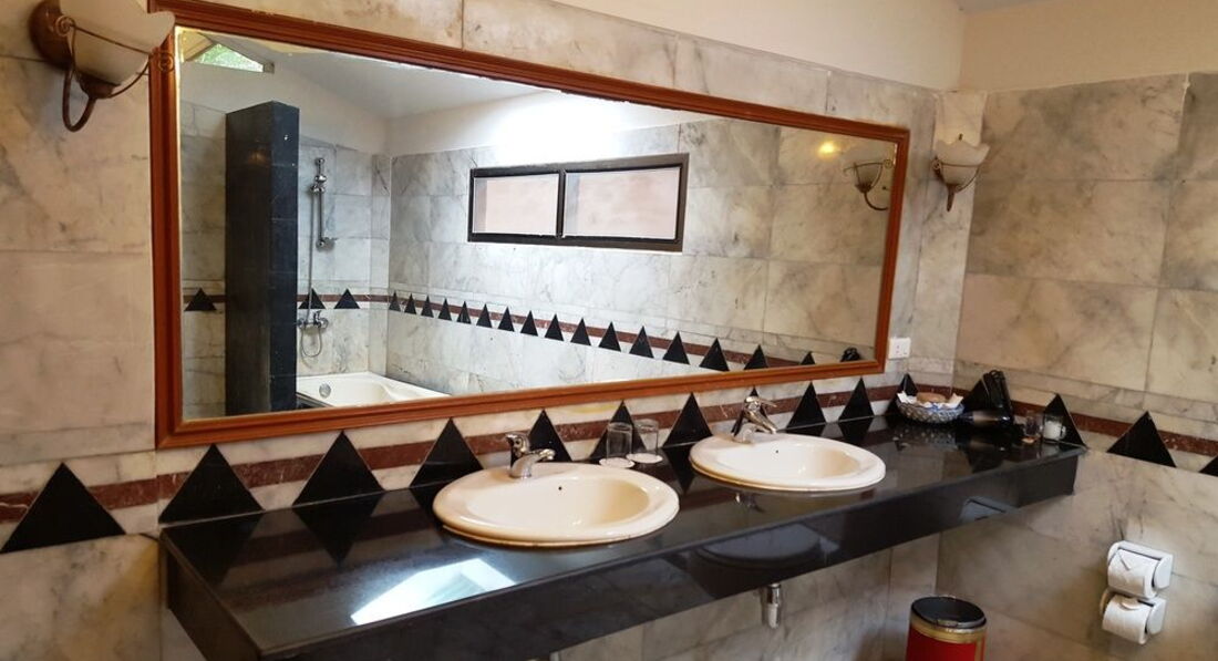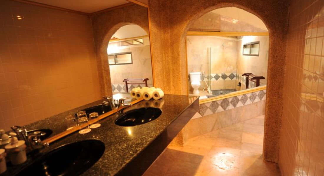В ванной все принадлежности: фен, мыло, стаканчики для принадлежностей, гель для душа, шампунь (причем очень густой), ватные палочки и квадратики, 2 полотенца для рук, 2 тела, 2 для ног (не застиранные) и 2 пляжных. В ванной две раковины, очень удобно особенно с утра, в ванной мы, конечно же не мылись, душ вмонтирован в стену, но поворачивается, рядом с унитазом есть шланг, ребенка я споласкивала им… удобно, чем просто душ вся вода остается в ванной, нет луж около раковины.