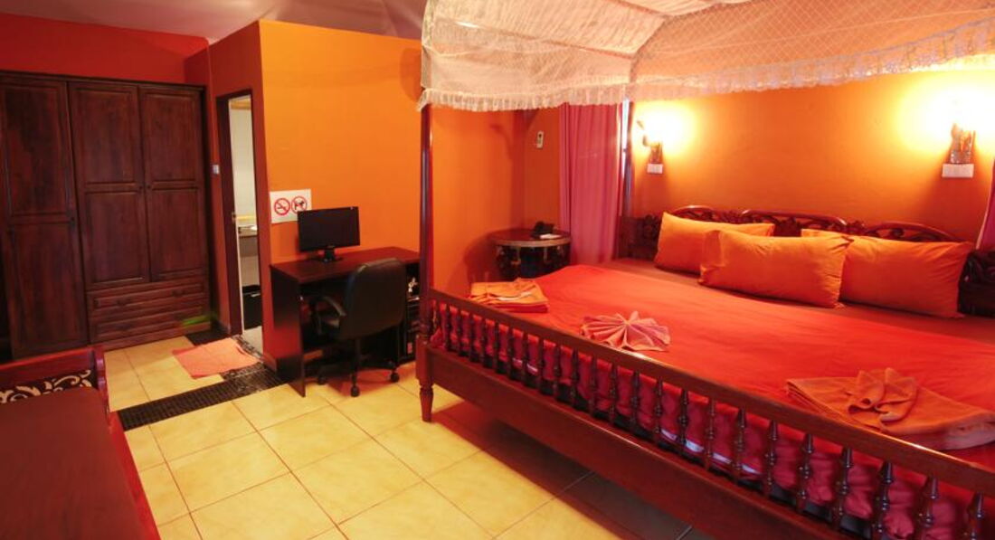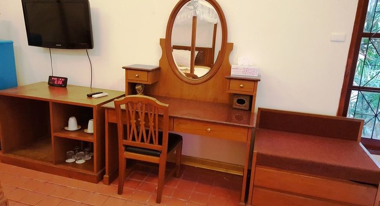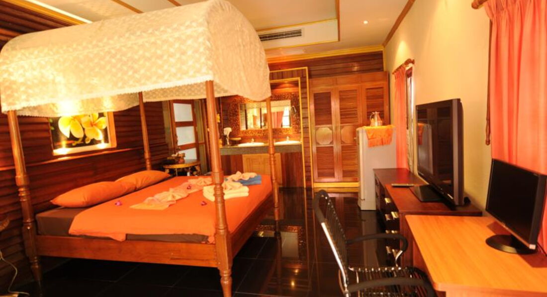 Бунгало вполне приличные. Кровать огромная, но непривычно высокая, есть еще кушетка - впрочем, нам она не была не нужна. Кондиционер, телевизор, большой комод, холодильник, шкаф, отдельная вешалка для одежды (мы использовали ее часто как сушилку), весы напольные, халаты и тапочки. Дешевая обычная для 3-шек, небольшая, вода действительно желтая. Умываться и чистить зубы - куда ни что, а для питья использовали только бутилированную.