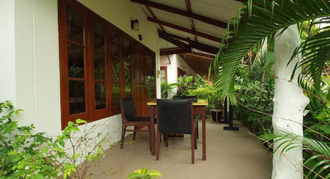 Приятным нюансом является наличие своей веранды у каждого бунгало. Буйная зелень почти загораживает вас от посторонних глаз. На веранде обычно стоит стол и кожаный диванчик или массивные стулья. Мы с удовольствием курили по вечерам на веранде, а в обед пили чай. Напротив отеля есть небольшой магазин 7 eleven, где есть самые необходимые товары и продукты. Там мы покупали кое-какую еду и в обед, после пляжа, устраивали чаепитие. Да, кстати, в номере есть электрический чайник и две пары чашек. На рынке брали местные фрукты.