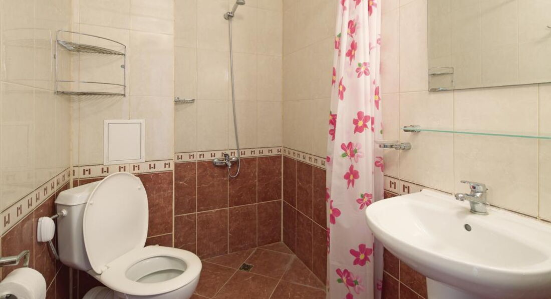 •ванна кімната з душем, туалетним приладдям