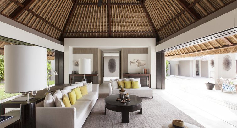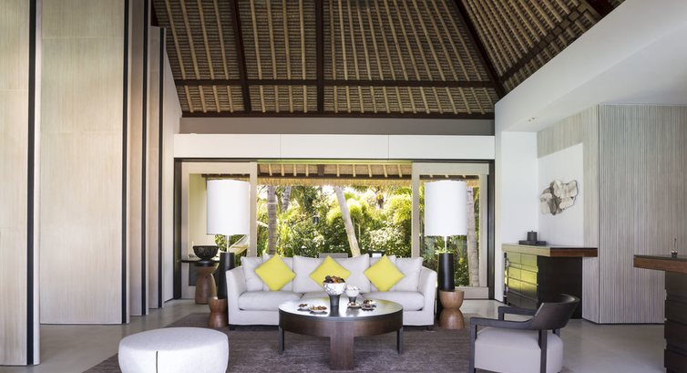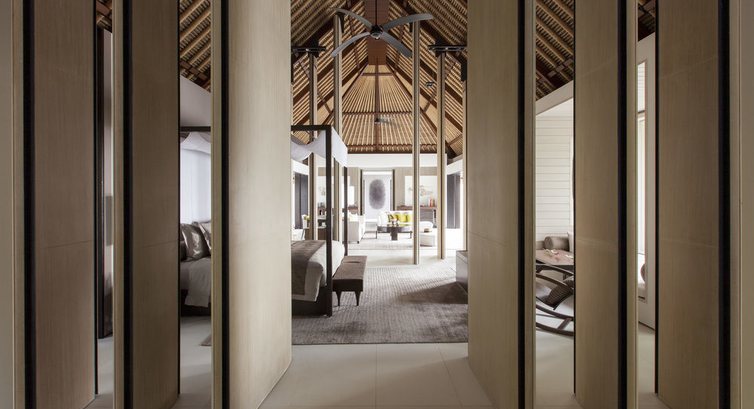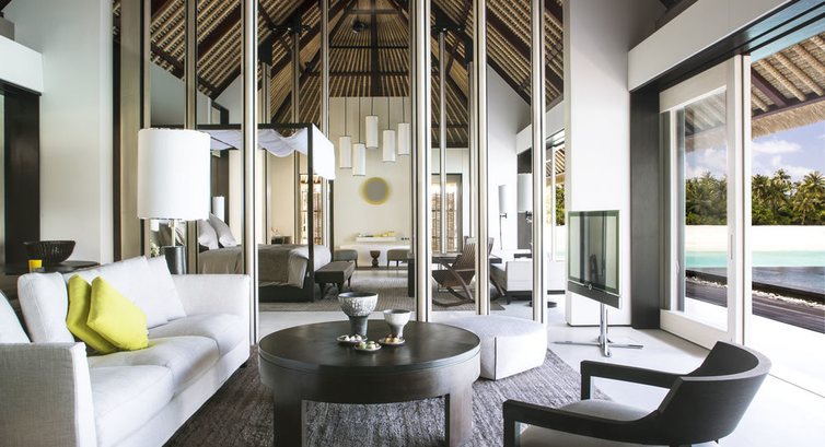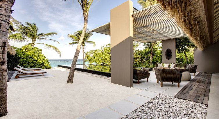 5 Island Villa Two Bedrooms (300 кв.м., берегове бунгало з двома спальнями, з зоною відпочинку в спальні, вітальня, суміжна з вітальнею, вбиральня, дві ванні кімнати з ванною та тропічним душем, відкрита тераса з виходом до басейну або на пляж , обідня зона.),