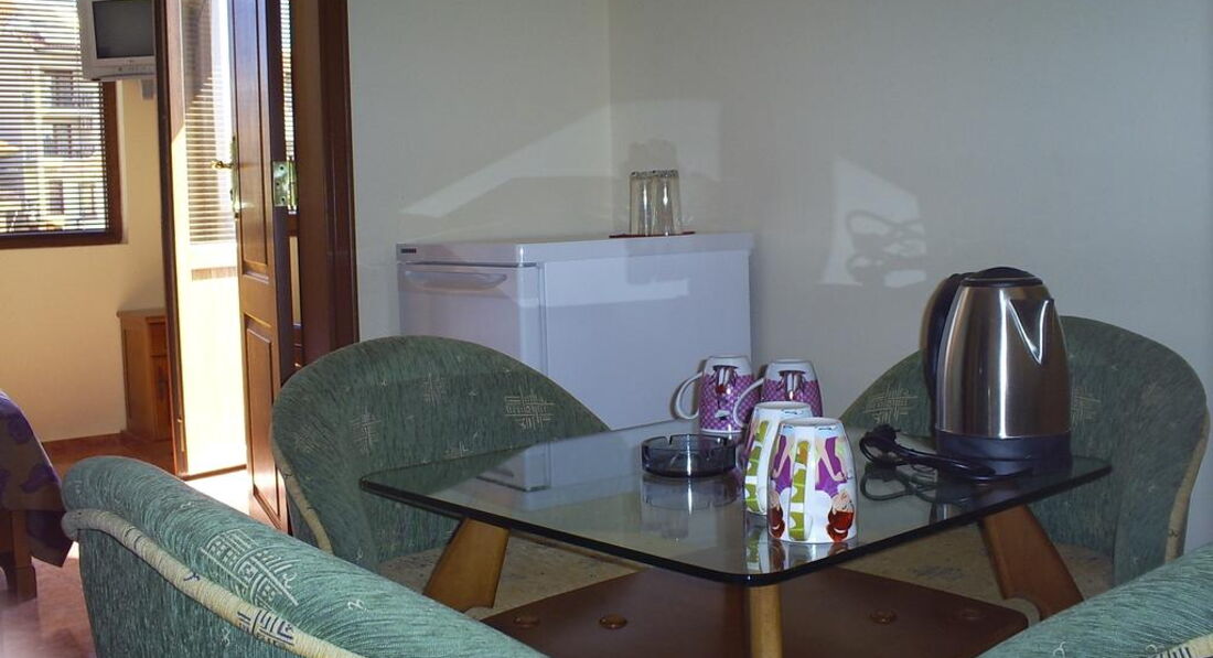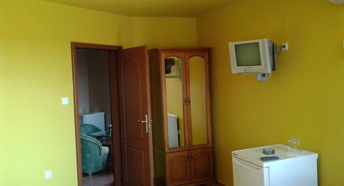 Замечательный семейный отель.Отдыхала с дочкой 7 лет.Рядом и море и развлечения, но сам отель не в эпицентре тусовки-поэтому спокойно и днём и ночью в номере.Самый простой номер на цокольном этаже-но из него дополнительный выход во двор с цветами!Любые вопросы и проблемы гостеприимные хозяева решали сразу же, в том числе и обмен денег на болгарские левы.Недалеко от отеля бак и банкомат-там снимала сразу левы с банковской карты в дальнейшем.В номере маленький холодильник, чайник- чашки.Фен надо попросить-дают сразу же, без залога и доп.платы.Утюг и гладильная доска на каждом этаже в свободном доступе.Питания нет-пару йогуртов на всякий случай держали в холодильнике.Завтракали в многочисленных бистро и кафе по пути на пляж, обедали и ужинали так же.Мебель в номере добротная,уборка качественная.И вообще самые позитивные впечатления и об отеле и о Созополе.
