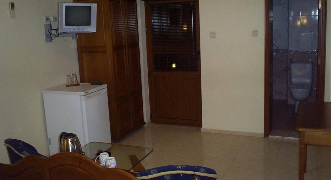 Номер полностью соответствует тому, что вы видите на официальном сайте. Поэтому описывать не буду. Все очень добротное, в рабочем состоянии, по-домашнему уютно. До пляжа Хармани идти медленным шагом 7 минут, до пляжа у Виллы Лист - 5. С питанием никаких проблем не было. Цены в Созополе очень демократичные, порции огромные. Особенно понравилась механа в Старом городе с прекрасным видом на море под названием Тангра. Были у них очень часто, все,что брали - необыкновенно вкусно. По деньгам - ужин на двоих (салат, 2 горячих не самых дешевых, пиво и фреш обходится примерно в 28 лев=560 руб.) Вообще, рекомендую питаться в небольших механах в Старом городе. во-первых, очень красиво, во-вторых дешевле, чем в новом городе. До Старого города от отеля медленным шагом примерно 10 минут. Рядом с отелем есть много магазинов, центральная торговая улица Ропотамо параллельна той, на которой стоит отель. Но никакого шума в отель благодаря хорошему стеклопакету не доносится. В шаговой доступности два больших супермаркета. Дешевле тот, который стоит на площади около стоянки такси.