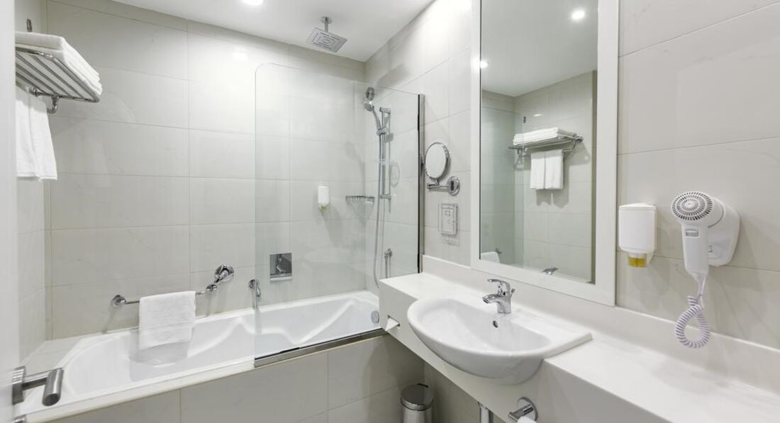 •ванна кімната з ванною, душем, туалетом та феном